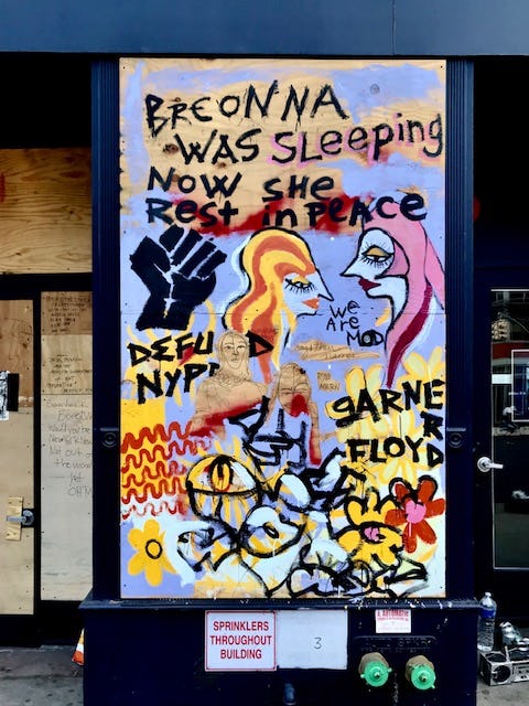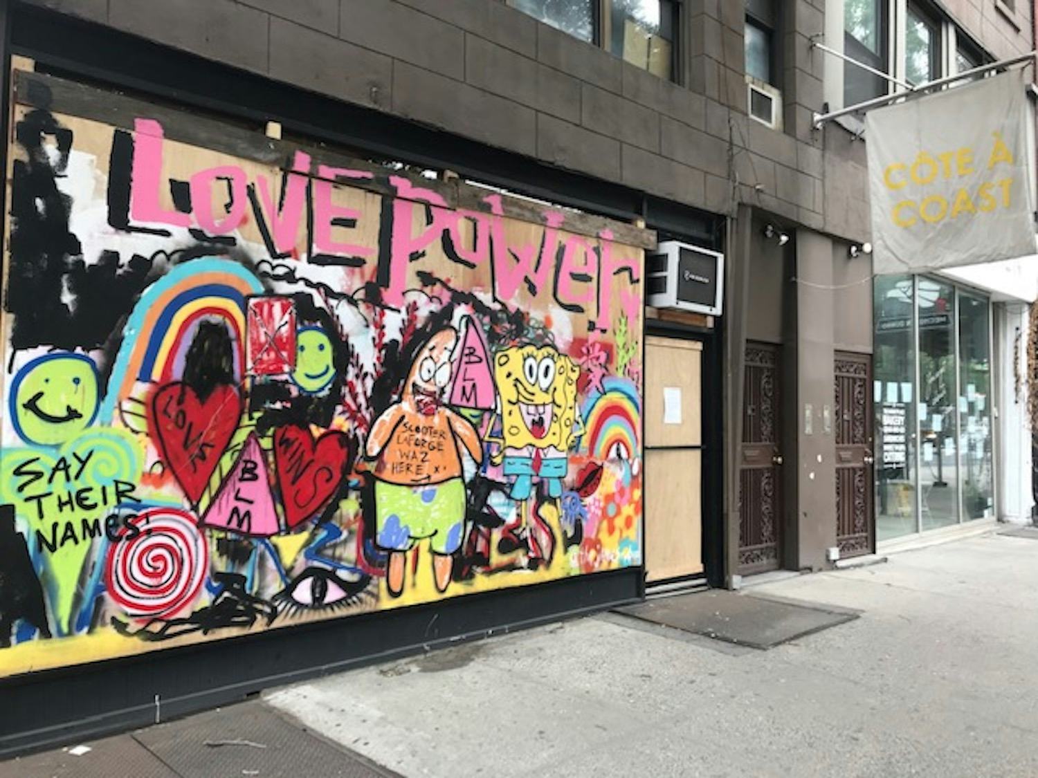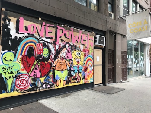 For months, plywood covered windows have been proliferating across the nation from Los Angeles to Washington D.C., causing lumber yards to report record sales. Initially the plywood went up after government mandated coronavirus lockdowns in March, but weeks later storefronts remained boarded up. As Kuwayama shared, many of the businesses she painted were damaged during the protests demanding justice for George Floyd. While the nationwide gatherings were largely peaceful, in late May and early June an estimated 450 city storefronts were looted or vandalized in New York City.