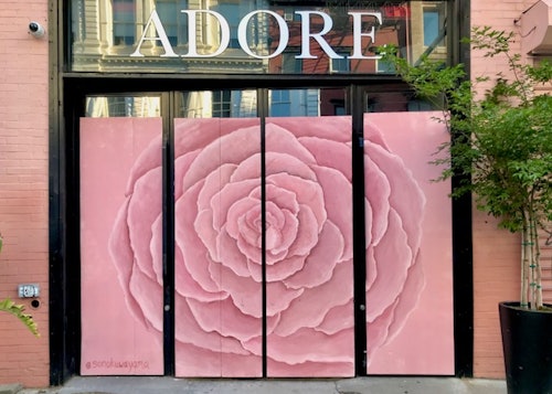 When artist Sono Kuwayama emerged from her coronavirus quarantine in May, she noticed an influx of boarded up windows across her Lower East Side neighborhood. After 100 days in isolation, the historically vibrant community had become a plywood jungle. As a native New Yorker, she wanted to bring some beauty back to her city. Inspired by art she’d seen in other areas of the burrough, she began covering the plywood with colorful murals. Her first was a towering pink rose that hung outside her friend’s florist shop.