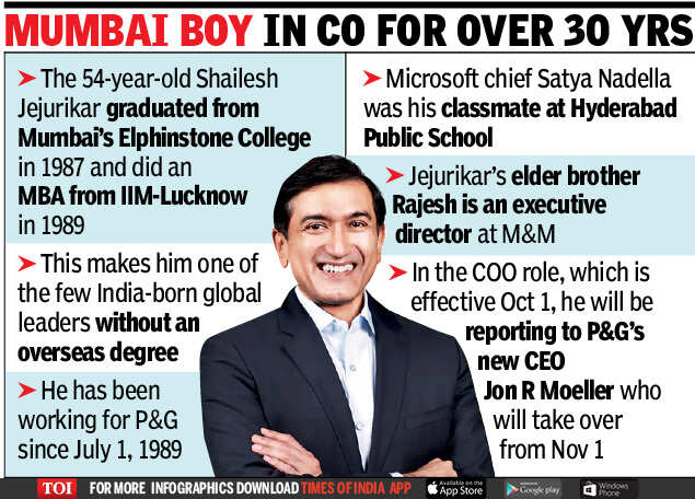 CHENNAI/MUMBAI: Shailesh Jejurikar has become the first Indian to be appointed global COO of the consumer products MNC Procter & Gamble (P&G). The Mumbai born 54-year-old Jejurikar is an alumni of the Hyderabad Public School and counts among his classmates another famous global CEO — Satya Nadella of Microsoft.