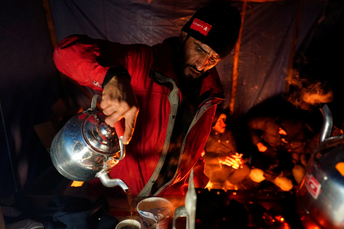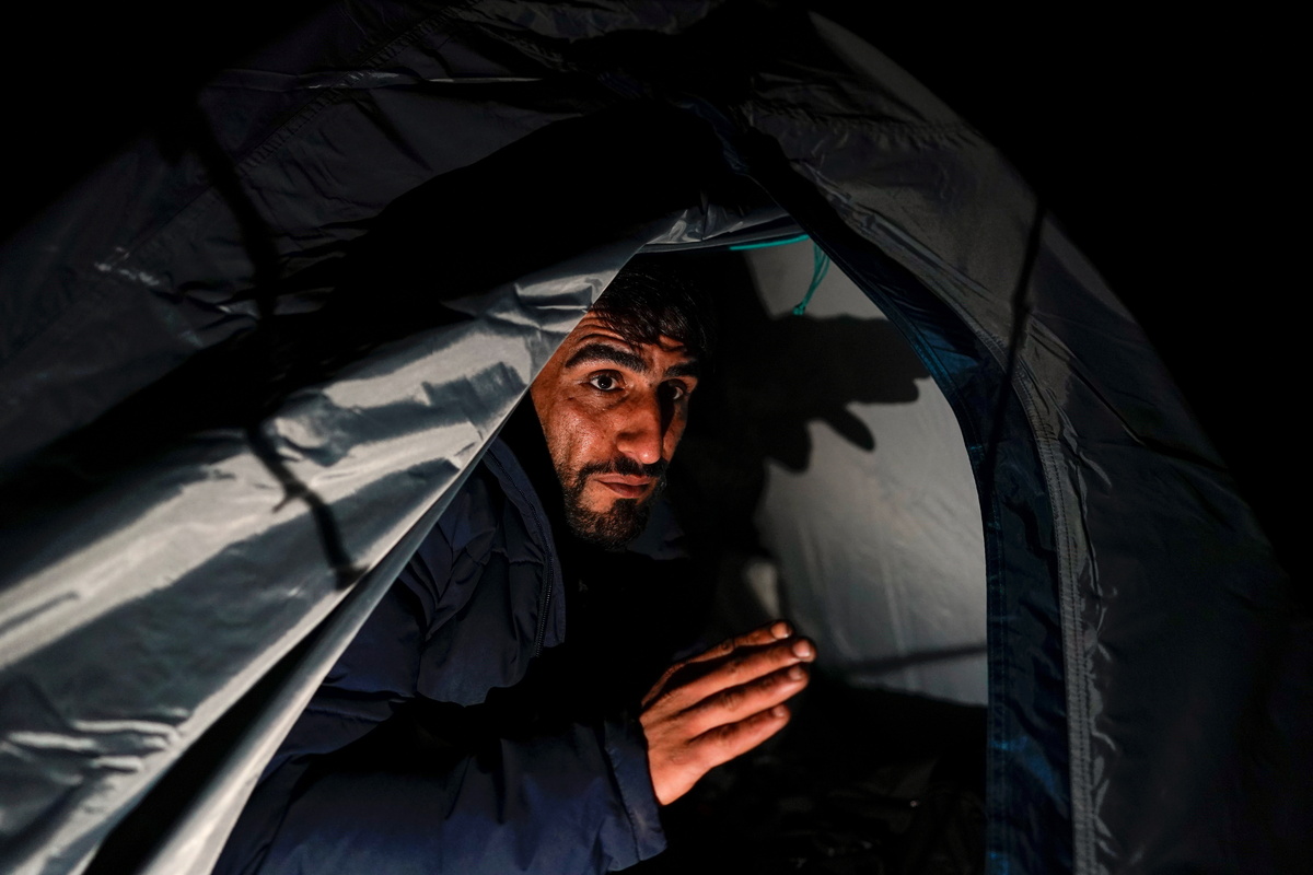 At night, when he is not cooking with his gas stove, Mahmud lights it inside his one-man tent and watches films. It is dangerous but he is freezing; the ground around his tent is muddy and his shoes are constantly wet.