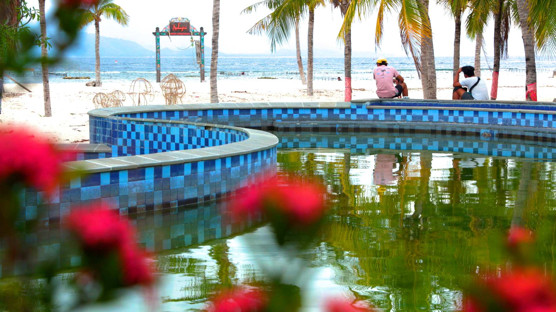)From the Nusa Lembongan beachfront, the thin outline of Bali's coast is faintly visible across the water, framed by the tempestuous Mount Agung looming behind.