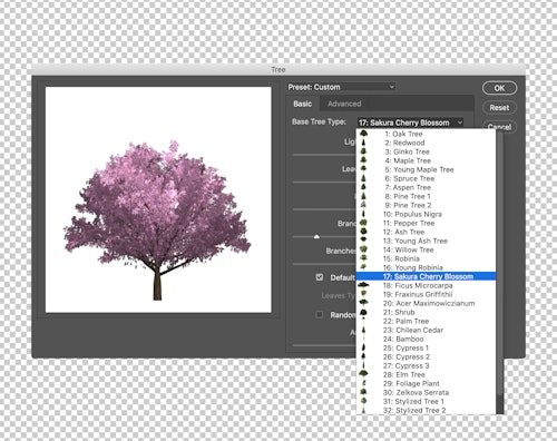 At this point, you may have questions. Why do these trees exist in Photoshop? Out of the world’s 60,000-plus species, why choose Fraxinus griffithii and Ficus microcarpa? And why do all the options look like they came from the PlayStation 2 era?