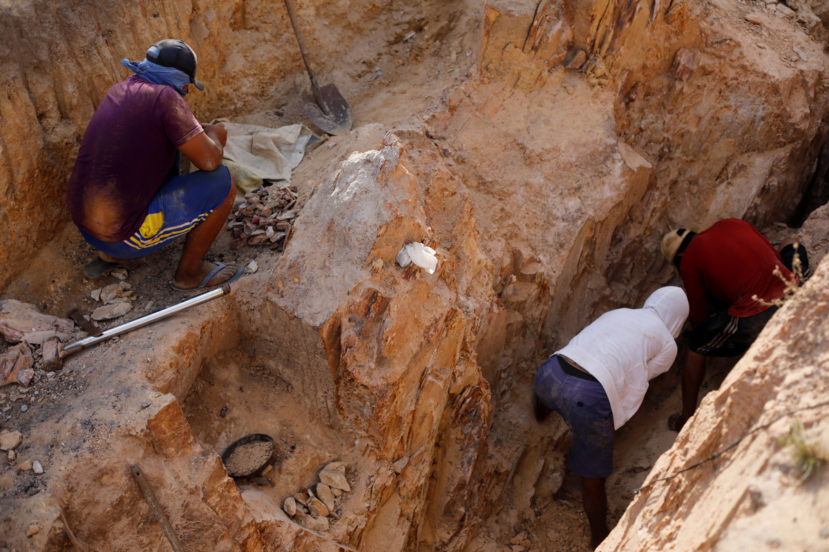 At a riverside pit near Silva's home, where her father has been living under tarpaulin for weeks, a small group dig below the beating sun.