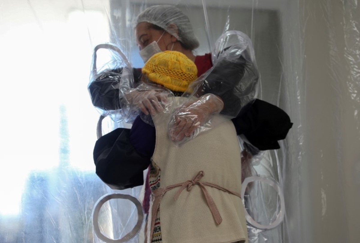 Terezinha Alves hugs her sister Luiza Nagata, 76, through a plastic curtain at the 3i Bem-Estar - Residencial Senior nursing home, amid the coronavirus disease (COVID-19) outbreak, in Sao Paulo, Brazil May 30, 2020. REUTERS/Rahel PatrassoSuzana Lisboa hugs her father Raul Lisboa, 89, through a plastic curtain at the 3i Bem-Estar - Residencial Senior nursing home, amid the coronavirus disease (COVID-19) outbreak, in Sao Paulo, Brazil May 30, 2020. REUTERS/Rahel PatrassoOssimar Silva touches his mother Carmelita Valverde, 85, through a plastic curtain at the 3i Bem-Estar - Residencial Senior nursing home, amid the coronavirus disease (COVID-19) outbreak, in Sao Paulo, Brazil May 30, 2020. REUTERS/Rahel PatrassoWorkers disinfect a plastic curtain that people hug their relatives through, at the 3i Bem-Estar - Residencial Senior nursing home, amid the coronavirus disease (COVID-19) outbreak, in Sao Paulo, Brazil May 30, 2020. REUTERS/Rahel Patrasso