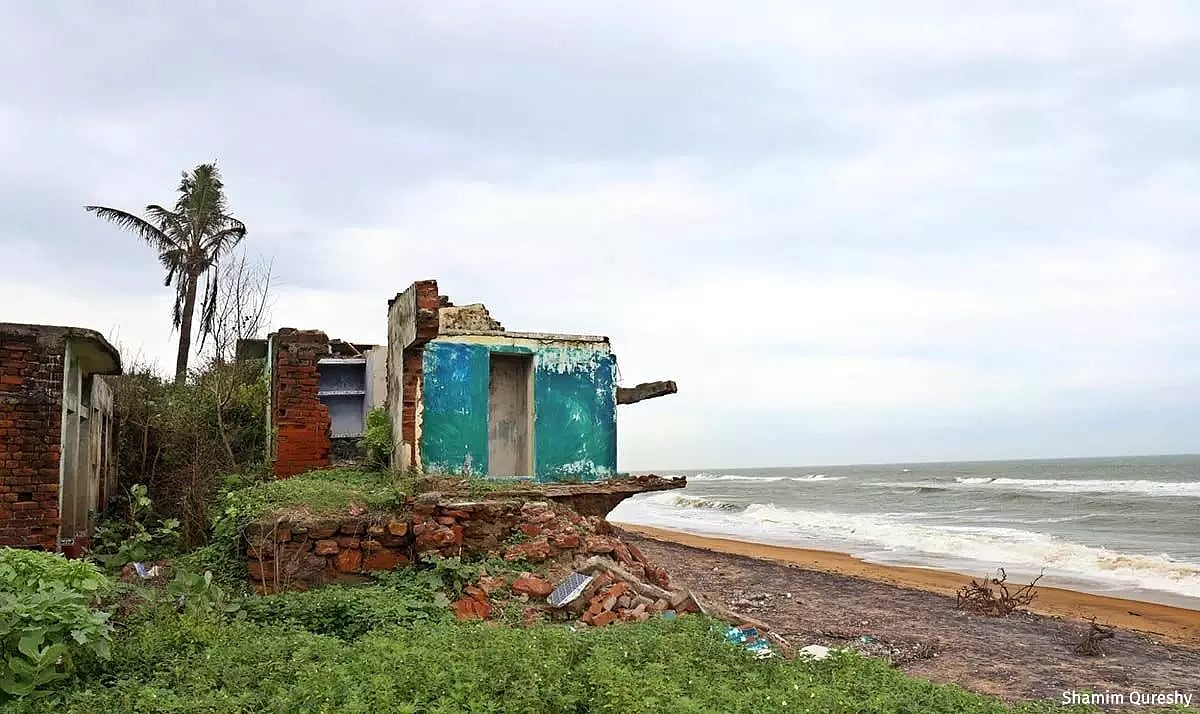 Podampeta, which hugs the coast of the Bay of Bengal, bears the scars of climate change like an open wound. Once home to approximately 475 families, the village was swallowed steadily by the sea. And its people, mostly from the fishing community, were forced to move. Today, old Podampeta has the eerie feel of a ghost village, with crumbling homes clinging to the shore, their ruins strangled by creepers. Padmini’s is one of only two families that continue to stay there; the rest now live in New Podampeta, 2 km away.