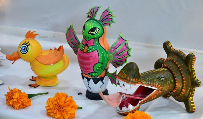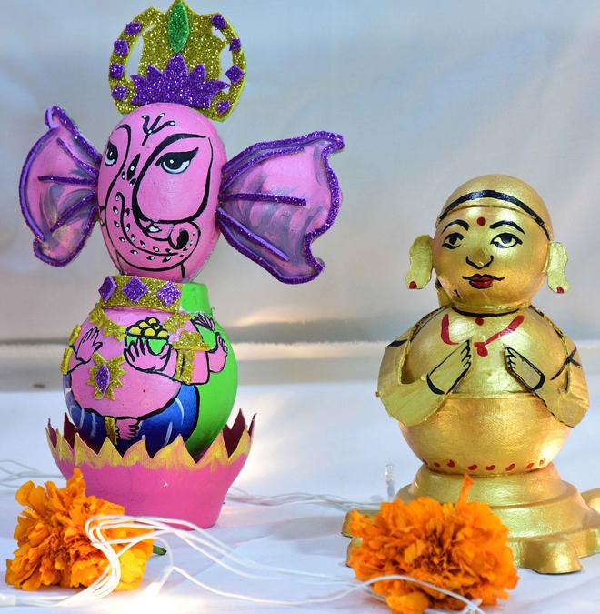 “Every single mould we make out of bio-degradable wastes like sugarcane bagasse or paddy straw becomes a learning tool for children,” says city-based Suresh Kumar Vishwanathan, the founder of Kraftoons, a company that makes eco-friendly toys. His golu featuring handcrafted deities, peacocks, cows, parrots and elephants made from a combination of sugarcane bagasse moulds has been attracting a steady stream of visitors, especially school students from the city. “Our dolls are a mix of art and craft. While children handcraft the dolls, for example, a peacock using round moulds and heart-shaped ones (for feathers), they also learn to use colours for a neat finish. Two round moulds, when put together, make the head and body of a cow while a turtle mould forms the base of a Shivalinga. As they mould, they learn about free form shapes, and bio-miniatures, which are shapes adapted from Nature,” explains Suresh, who also makes moulding machines.