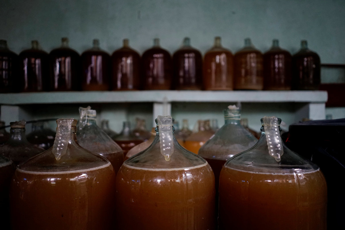 The rubber inflates and become erect as the fermentation releases gases; when it collapses, the process is complete. Estevez then sells the wine in his garage.