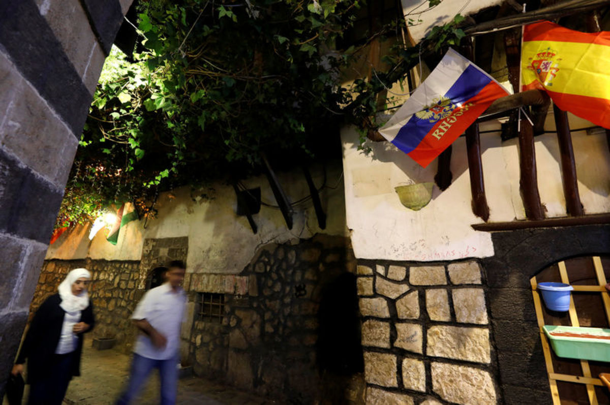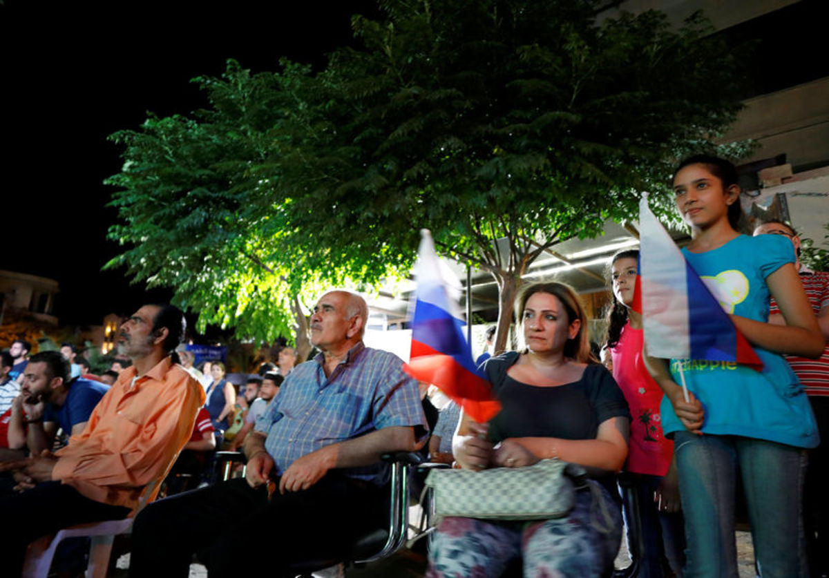 Russian flags were being waved by fans watching Tuesday's match at an open-air screen in a street in Damascus, where just last month the government and its allies crushed the last remaining rebel enclave.