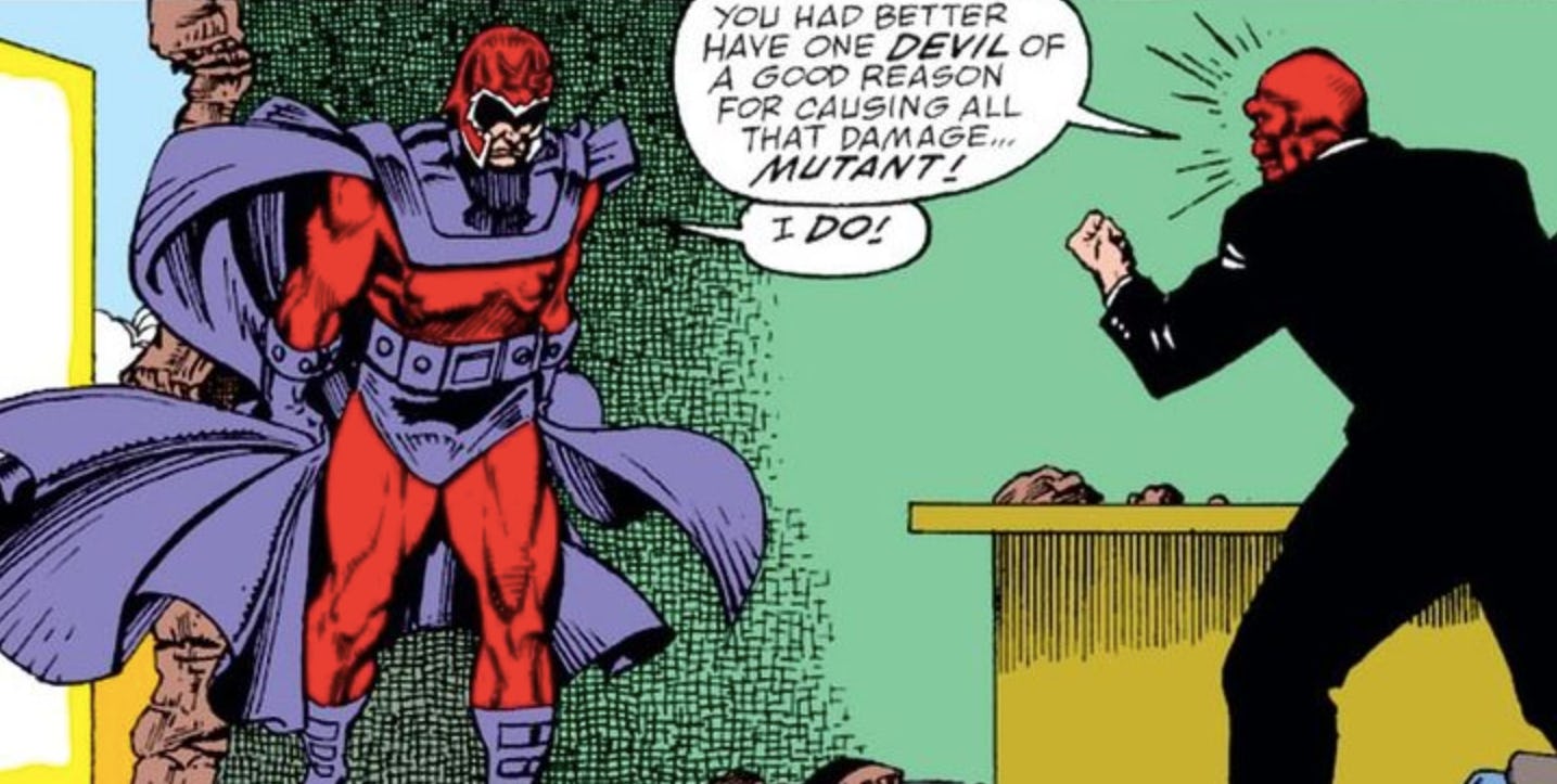 It’s not surprising to find that if you are anything other than white or a man, your actual superpower is some accessible feature of your culture or your reaction to whatever oppression you face in the “real world,” what you do to use that oppression against itself. And the story always seems to be that you are either born with the innate ability or learn through an unforeseen trauma how to weaponize that oppression and win against the many forces that oppose you. This part isn’t just for superhero narratives. It’s for supervillain narratives, too, like in X-Men, when it is discovered that Magneto’s powers actually degrade his psyche. The more he uses them, the more paranoid and delusional he becomes. For him to use his powers safely, his genetic code is altered without his consent.