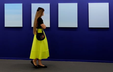 Signs of the pandemic are still everywhere: Social-distancing signs and hand sanitizer dispensers stand visible in the tents housing the galleries. People attending the fair can book a specific time slot in advance to guarantee their entry. Those worried about being around a crowd can take a virtual tour of the fair from home.