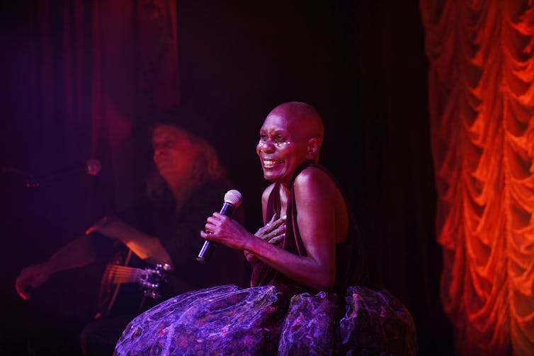 Statuesque in a red satin gown, “tradie by day, drag queen by night” Iva Rosebud strips back to a gold corset, then a strip of black tape, then nothing at all. Soulful Ngarluma jazz and blues singer Lois Olney and guitarist Dave Johnson round out the night with a languid rendition of George Gershwin’s Summertime.