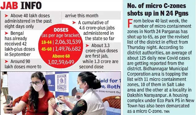 KOLKATA: The vaccinating pace is picking up a reasonably good speed in Bengal. More than 40 lakh doses have been administered in the first eight days of September. With regular supply of vaccine, health officials are hopeful of keeping up the inoculation momentum. In the past eight days, the state has been administering 5 lakh-plus doses per day.