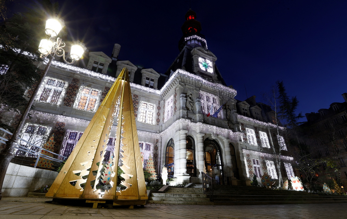 The town hall in the 12th arrondissement of Paris is lit up for the festive season but the traditional Christmas tree in the public square is absent. In its place stands a tree-shaped sculpture made of recycled wood.
