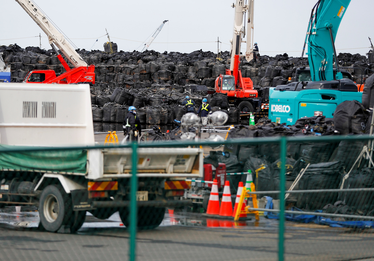 On the once-bustling main street, reddish weeds poked out of cracked pavements in front of abandoned shops with caved-in walls and crumbling roofs. Nearby, thousands of black plastic bags filled with irradiated soil were stacked in a former rice field.