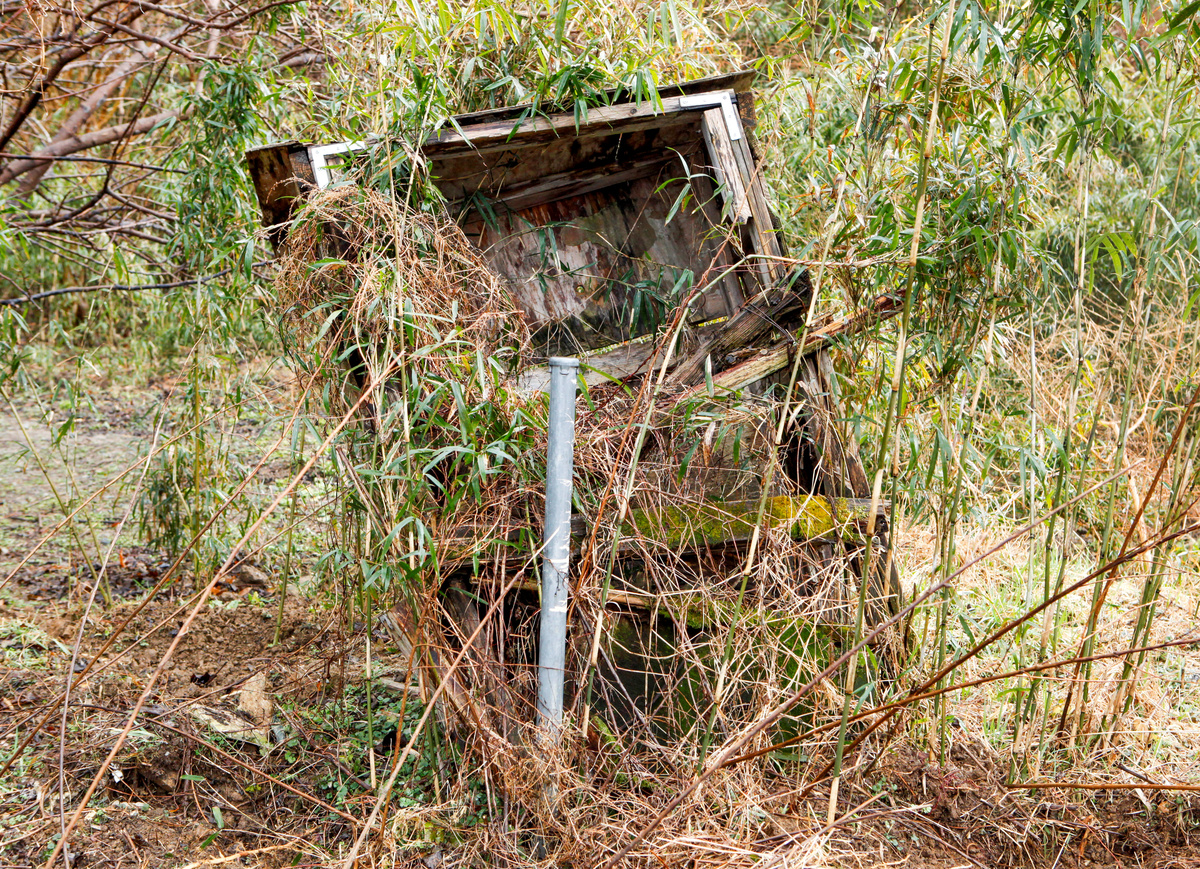 The block where Takahisa Ogawa's house once stood is now just a row of overgrown lots, littered with concrete debris. A small statue of a stone frog is all that remains of his garden, which is also scattered with wild boar droppings.