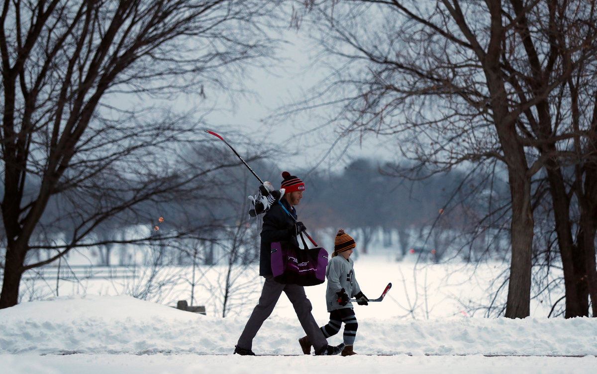 A father and daughter make their way to youth night during the U.S. Pond Hockey Championships on Lake Nokomis in Minneapolis, Minnesota, U.S. January 25, 2018. Picture taken January 25, 2018. REUTERS/Kevin Lamarque