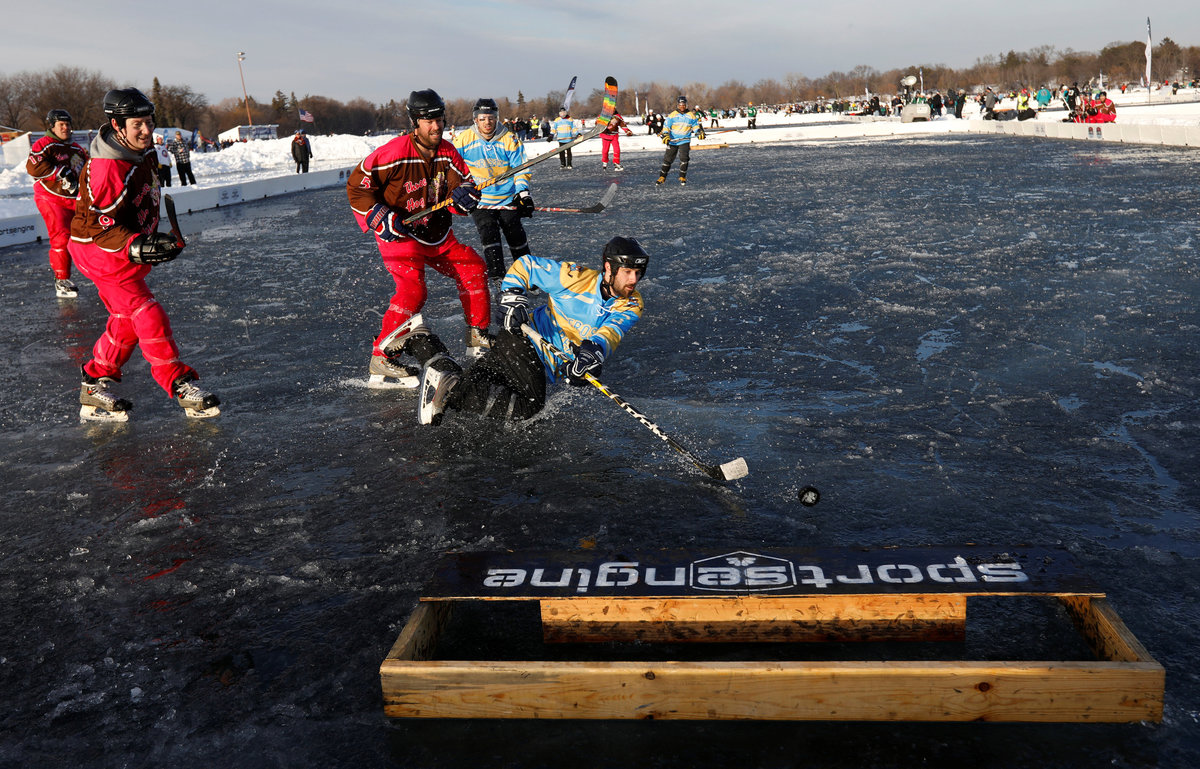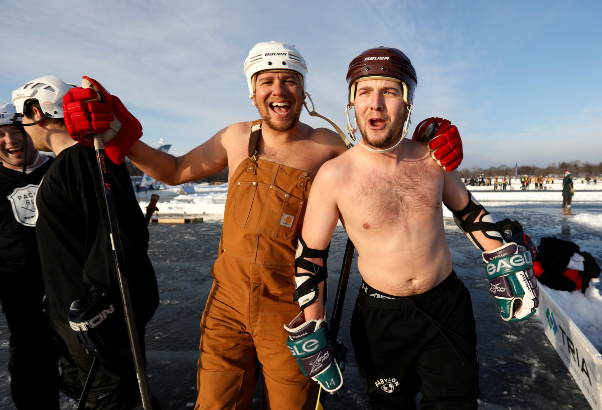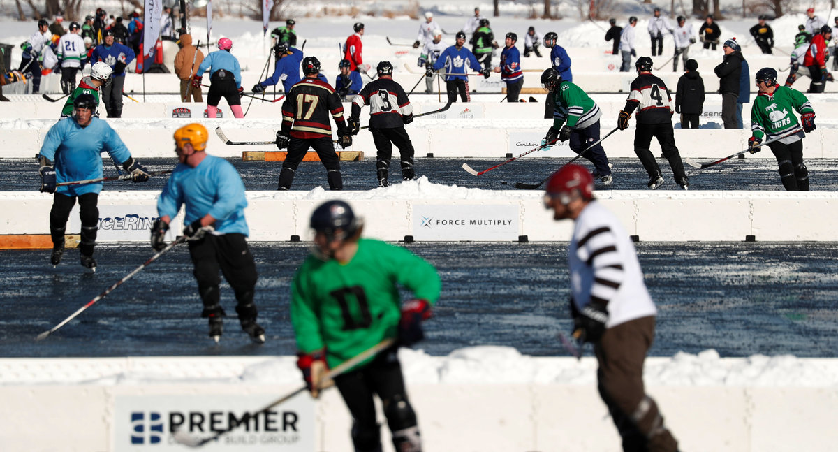 Four-player teams competing in seven divisions played 30-minute hockey games atop the frozen lake under frigid temperatures. The lake is a few miles away from the fixed-roof U.S. Bank Stadium in Minneapolis, where the temperature will be kept at 70 degrees F (21.1 C) for the Super Bowl even though forecasts call for 3 degrees (-16.1 C) outdoors.