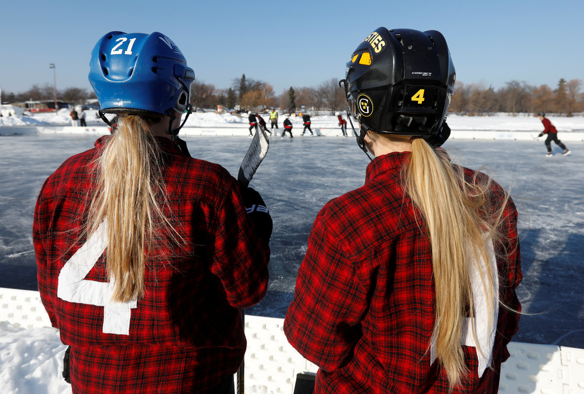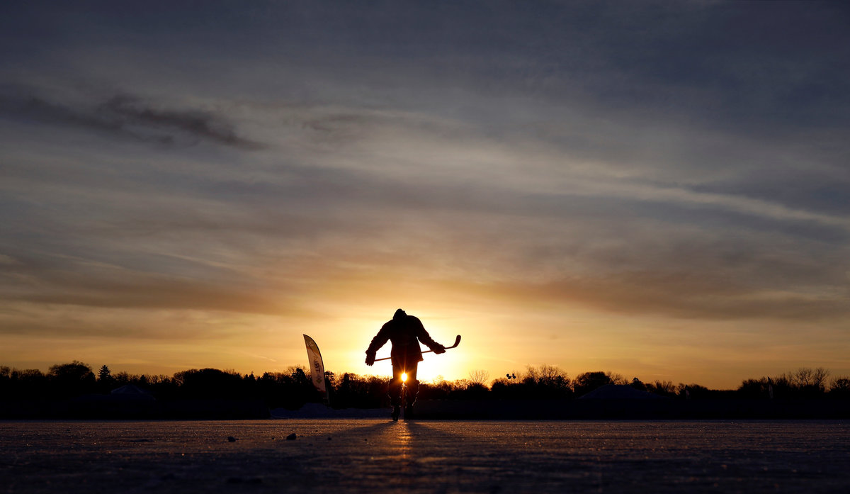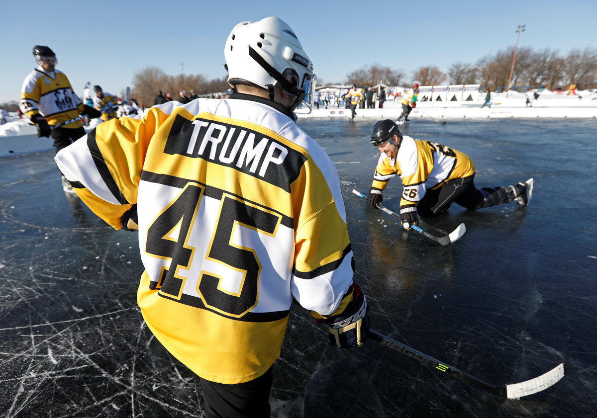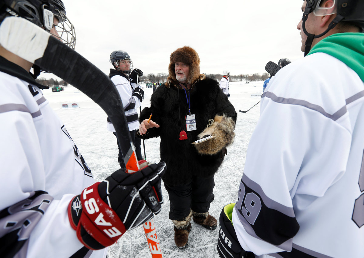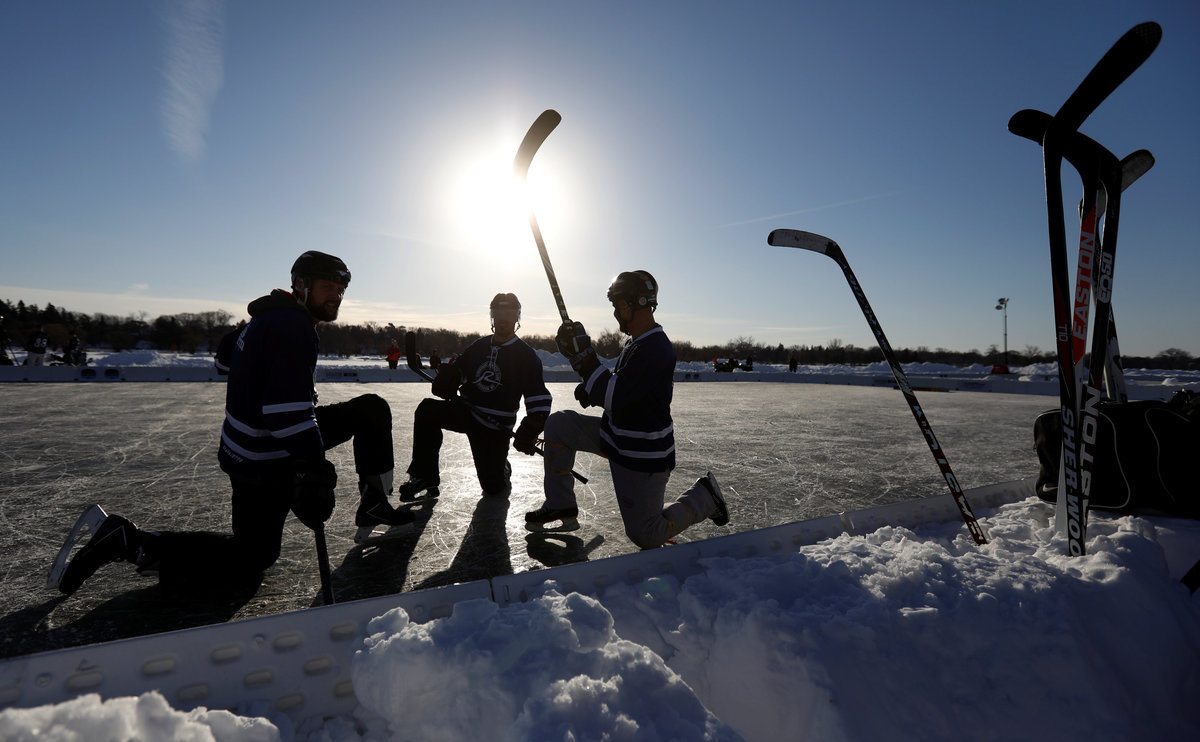 A hockey player takes to the ice at sunrise for the U.S. Pond Hockey Championships on Lake Nokomis in Minneapolis, Minnesota, U.S. January 26, 2018. Picture taken January 26, 2018. REUTERS/Kevin LamarqueDespite puddles from melting ice, players compete in the U.S. Pond Hockey Championships on Lake Nokomis in Minneapolis, Minnesota, U.S. January 26, 2018. Picture taken January 26, 2018. REUTERS/Kevin LamarqueMembers of women's team Consistently Cuatro watch their teammate play during the U.S. Pond Hockey Championships on Lake Nokomis in Minneapolis, Minnesota, U.S. January 27, 2018. Picture taken January 27, 2018. REUTERS/Kevin LamarqueReferee Tony Gogolakis, affectionately and appropriately known "Roadkill" for his complete animal fur wardrobe, speaks with a team during a game at the U.S. Pond Hockey Championships on Lake Nokomis in Minneapolis, Minnesota, U.S. January 28, 2018. Picture taken January 28, 2018. REUTERS/Kevin LamarquePlayers stay warm between games during the U.S. Pond Hockey Championships on Lake Nokomis in Minneapolis, Minnesota, U.S. January 28, 2018. Picture taken January 28, 2018. REUTERS/Kevin LamarqueA player smiles through his mask at the U.S. Pond Hockey Championships on Lake Nokomis in Minneapolis, Minnesota, U.S. January 26, 2018. Picture taken January 26, 2018. REUTERS/Kevin LamarqueA player wears a well worn skate at the U.S. Pond Hockey Championships on Lake Nokomis in Minneapolis, Minnesota, U.S. January 26, 2018. Picture taken January 26, 2018. REUTERS/Kevin LamarqueA player from losing team Orange Theory Fitness crashes into the boards during the men's open final of the U.S. Pond Hockey Championships on Lake Nokomis in Minneapolis, Minnesota, U.S. January 28, 2018. Picture taken January 28, 2018. REUTERS/Kevin LamarqueA player wears a jersey with the name and number of U.S. President Donald Trump during the U.S. Pond Hockey Championships on Lake Nokomis in Minneapolis, Minnesota, U.S. January 26, 2018. The entire team took names of actors in the movie "Home Alone 2" in which Trump had a cameo appearance. Picture taken January 26, 2018. REUTERS/Kevin LamarquePlayers convene during a break at the U.S. Pond Hockey Championships on Lake Nokomis in Minneapolis, Minnesota, U.S. January 26, 2018. Picture taken January 26, 2018. REUTERS/Kevin Lamarque
