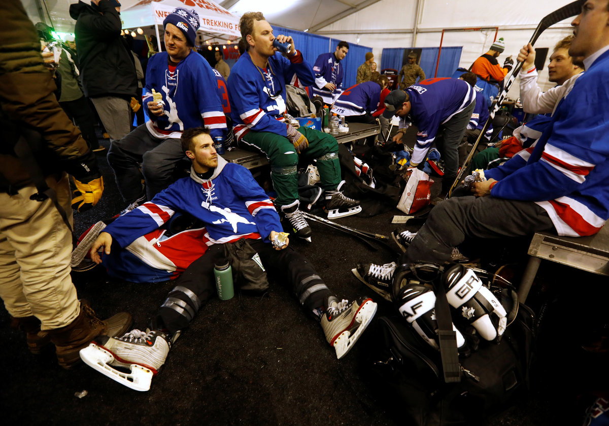 When not on the ice, players gathered in a huge warming tent, where they changed into their gear and stayed out of the elements. The soupy air inside carried the distinct scent of well-used hockey gear, but the mood was jovial as players enjoyed the company of like-minded hockey enthusiasts.