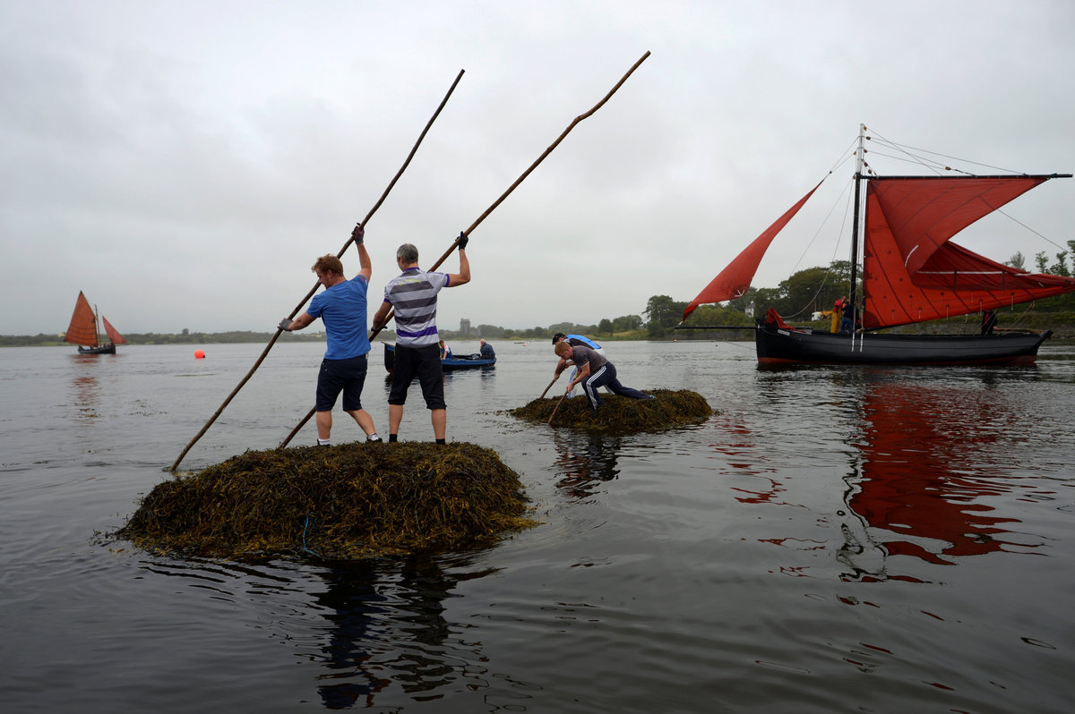 Teams participate in a seaweed race, each pushing a two tonne seaweed bundle known as Climin from the sea to the harbour finish line during Cruinniu na mBad (gathering of the boats) regatta in Kinvara, Ireland, August 20, 2017. REUTERS/Clodagh Kilcoyne