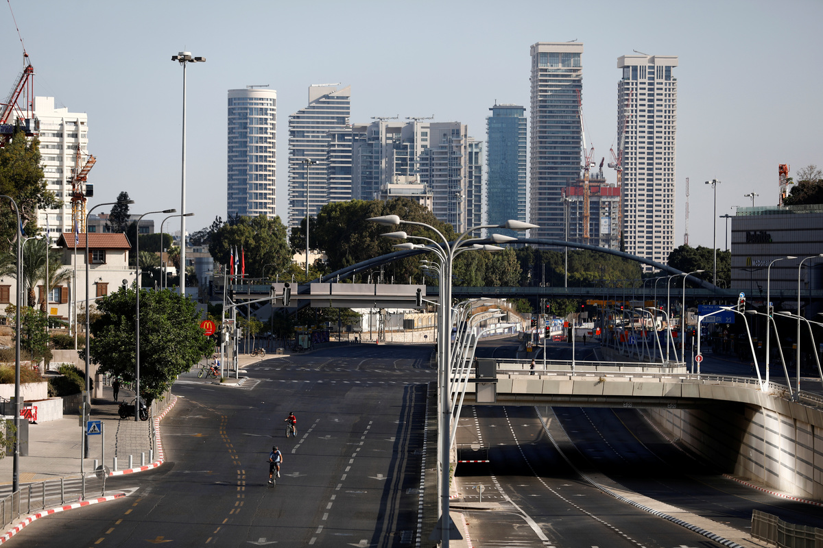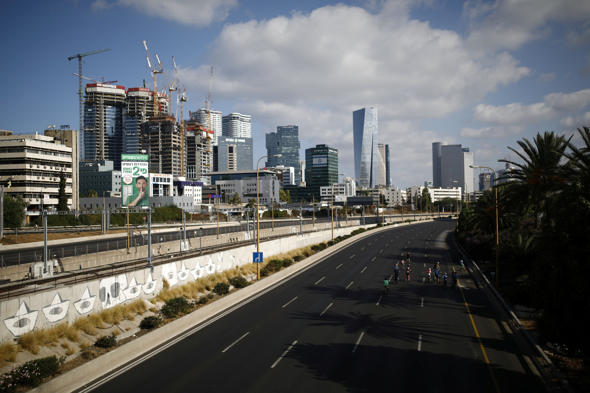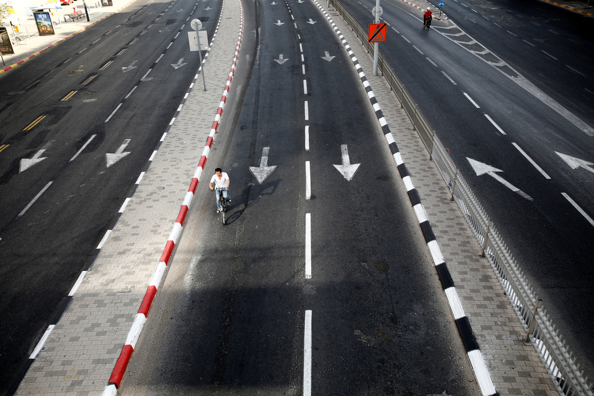 Adults and children take advantage of the deserted highways to ride bicycles, scooters and skateboards without fear of being hit by cars or trams, even in major cities such as Tel Aviv and Jerusalem.