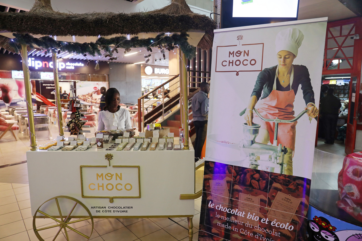 A vendor sells "Mon Choco", handmade organic raw chocolates made with cocoa beans ground with the help of a bicycle in Abidjan, Ivory Coast January 23, 2019. REUTERS/Luc Gnago