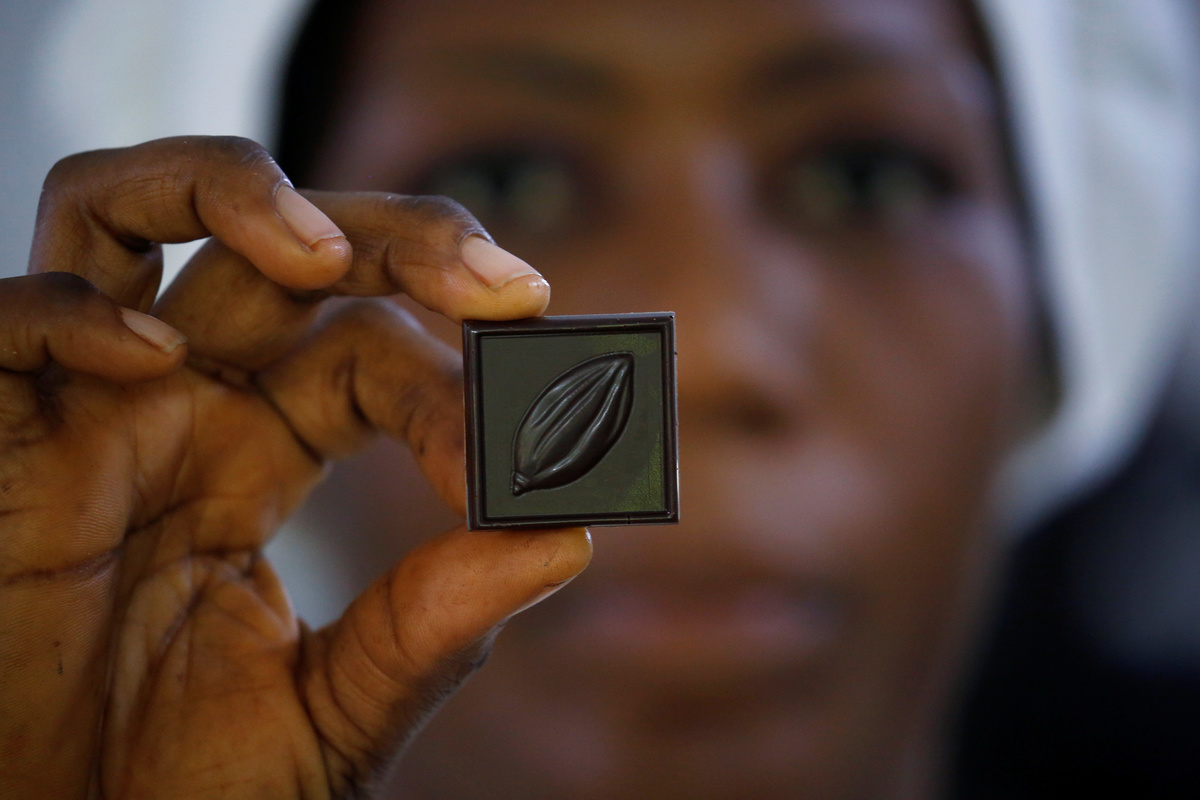 A worker holds a piece of Mon Choco" chocolate, handmade organic raw chocolates made with cocoa beans ground with a bicycle in Abidjan, Ivory Coast January 10, 2019. Picture taken January 10, 2019. REUTERS/Luc Gnago