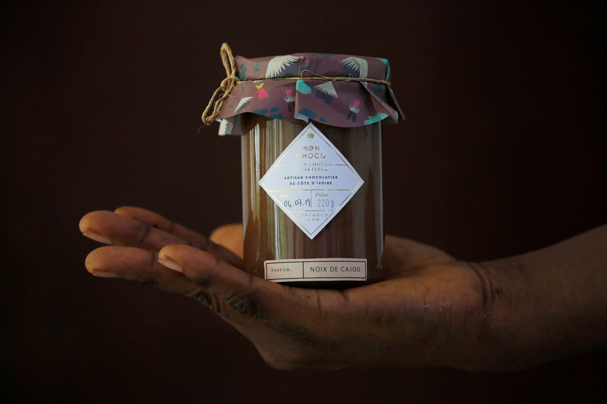 A worker holds a jar of "Mon Choco", handmade organic raw chocolates made with cocoa beans ground with the help of a bicycle in Abidjan, Ivory Coast January 10, 2019. Picture taken January 10, 2019. REUTERS/Luc GnagoA worker at the handmade organic raw chocolate factory "Mon Choco", prepares to grind cocoa beans with the help of a bicycle in Abidjan, Ivory Coast January 10, 2019. Picture taken January 10, 2019. REUTERS/Luc GnagoA worker holds bars of "Mon Choco", handmade organic raw chocolates made with cocoa beans ground with the help of a bicycle in Abidjan, Ivory Coast January 10, 2019. Picture taken January 10, 2019. REUTERS/Luc GnagoDana Mroueh, owner of the handmade organic raw chocolate factory "Mon Choco", grinds cocoa beans with the help of a bicycle in Abidjan, Ivory Coast January 10, 2019. Picture taken January 10, 2019. REUTERS/Luc GnagoDana Mroueh, owner of the handmade organic raw chocolate factory "Mon Choco", prepares to grind cocoa beans with the help of a bicycle in Abidjan, Ivory Coast January 10, 2019. Picture taken January 10, 2019. REUTERS/Luc GnagoDana Mroueh, owner of the handmade organic raw chocolate factory "Mon Choco", grinds cocoa beans with the help of a bicycle in Abidjan, Ivory Coast January 10, 2019. Picture taken January 10, 2019. REUTERS/Luc Gnago