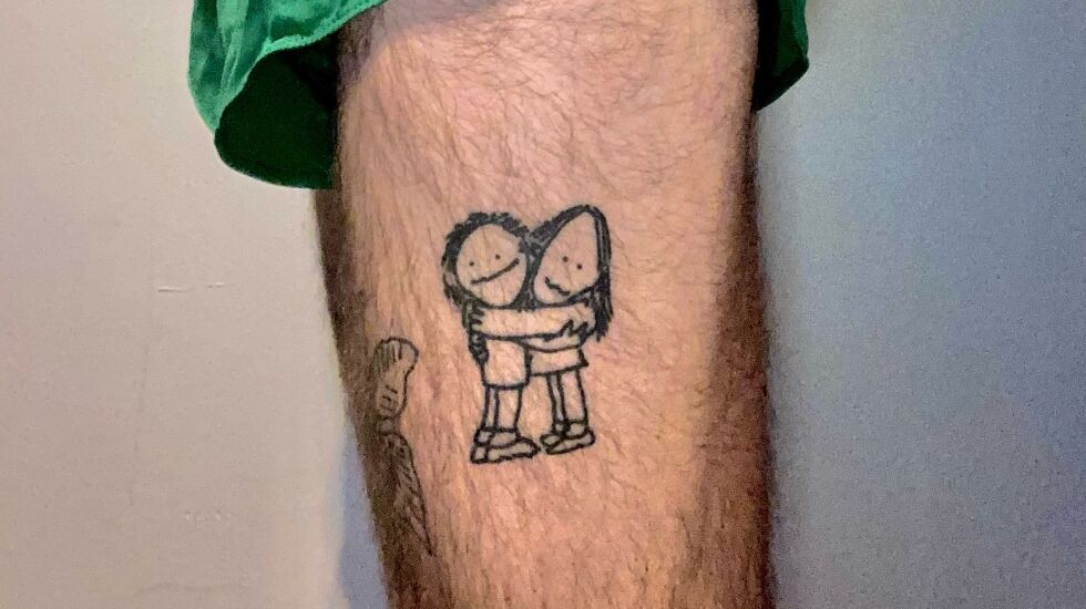 The two tattooed characters, drawn in Silverstein’s sketchbook style, hug one another with soft smiles, heads tilted in opposite directions.