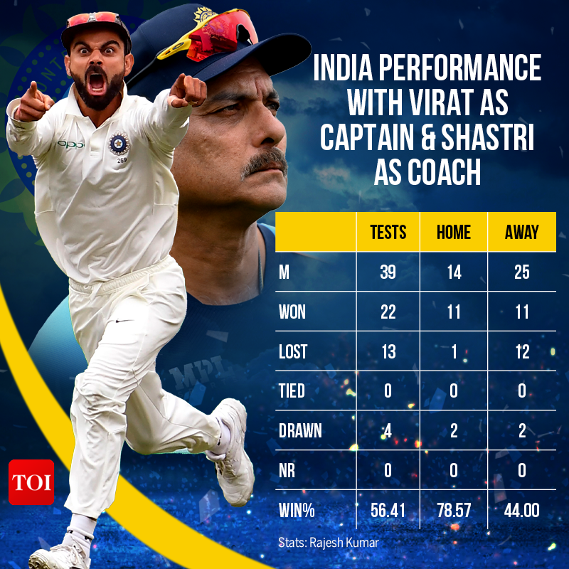 Out of the 39 Tests which India played with Virat as captain and Shastri as coach, they won as many as 22 for a win percentage of 56.41. The team lost 13 Tests and drew four in this era.
