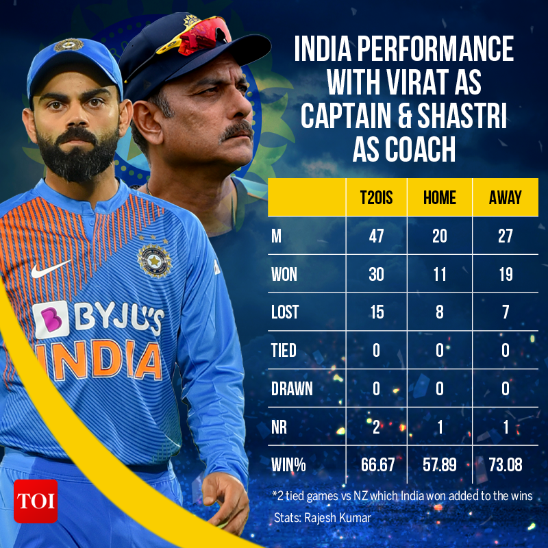 In the shortest format of the game as well, India had a very good record under Virat as captain and Shastri as coach. Of a total of 47 T20Is played in this period, India won 30 and lost 15 games. Two matches ended as NR. The two India vs New Zealand games in Hamilton and Wellington in January 2020 which ended as ties were won by India via the one over eliminator and have been added to the wins section here.