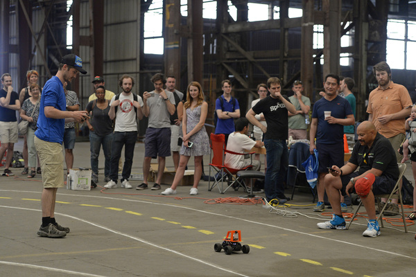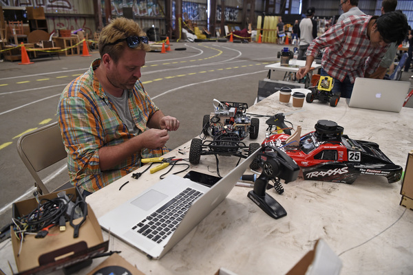 Each month, anywhere from a few dozen to 100 people gather at a vacant Oakland warehouse. There's no electricity and no flush toilets, just a handful of folding tables and a race course hastily etched in white and yellow paint on the concrete floor, where teams of hackers go head-to-head in a battle to see whose car is fastest, or at least, which one can complete the course.