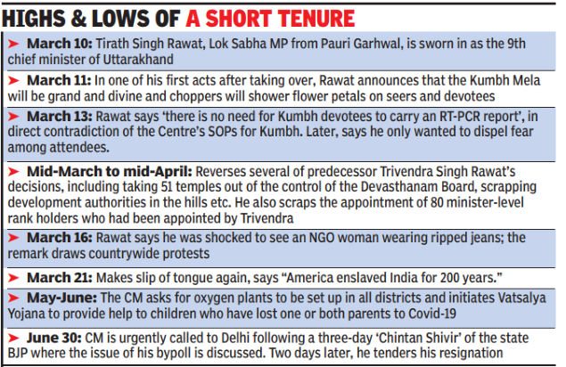 DEHRADUN: With a tenure of just under four months, Tirath Singh Rawat became the CM with shortest term in office by any CM in the Himalayan state. After being carved out of Uttar Pradesh on November 9, 2000, the state has seen as many as nine people hold the CM’s post in a period of 21 years.