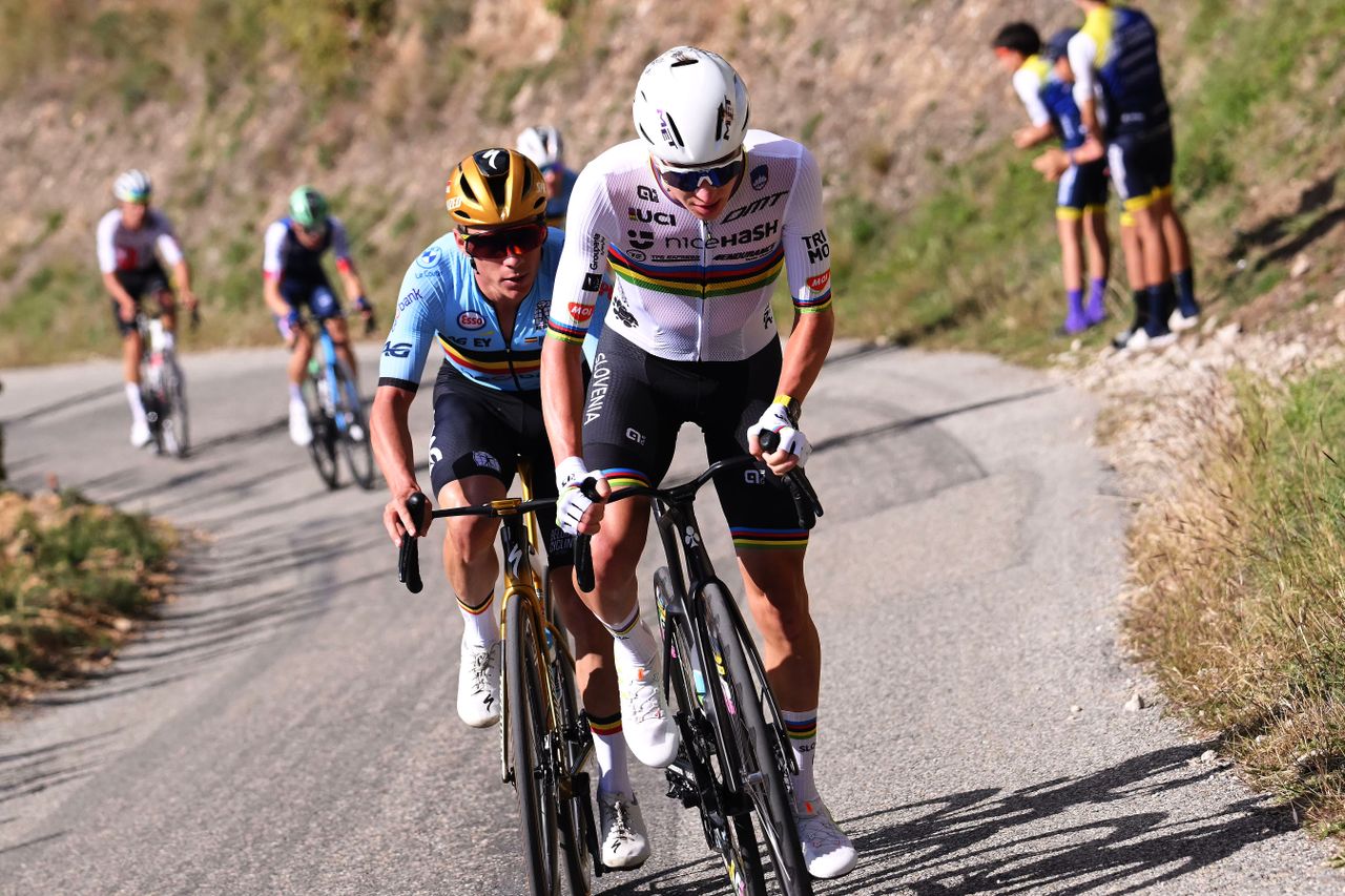 Pogačar began to apply maximum pressure with 76km to go. Only Evenepoel could follow initially, but soon he started to look over his shoulder, and then he had to pull the pin. The watts were too high and he wouldn't see Pogačar's rainbow jersey again, until arriving in Guilherand-Granges 75km later.