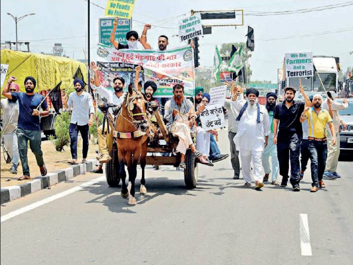 PANCHKULA: Farmers in Panchkula staged a protest against the state government against hike in prices of fuel and gas at Chandimandir toll plaza onThursday. The farmers, under the banner of Sanyukt Kisan Morcha (SKM), took to the roads with gas cylinders and cars. They blowed horns to show their ire at the hike in gas and fuel prices.