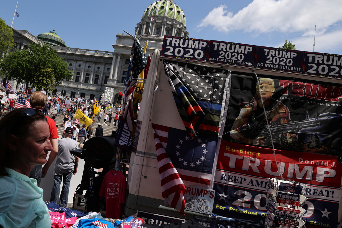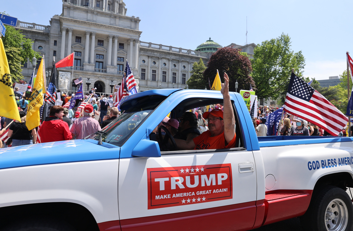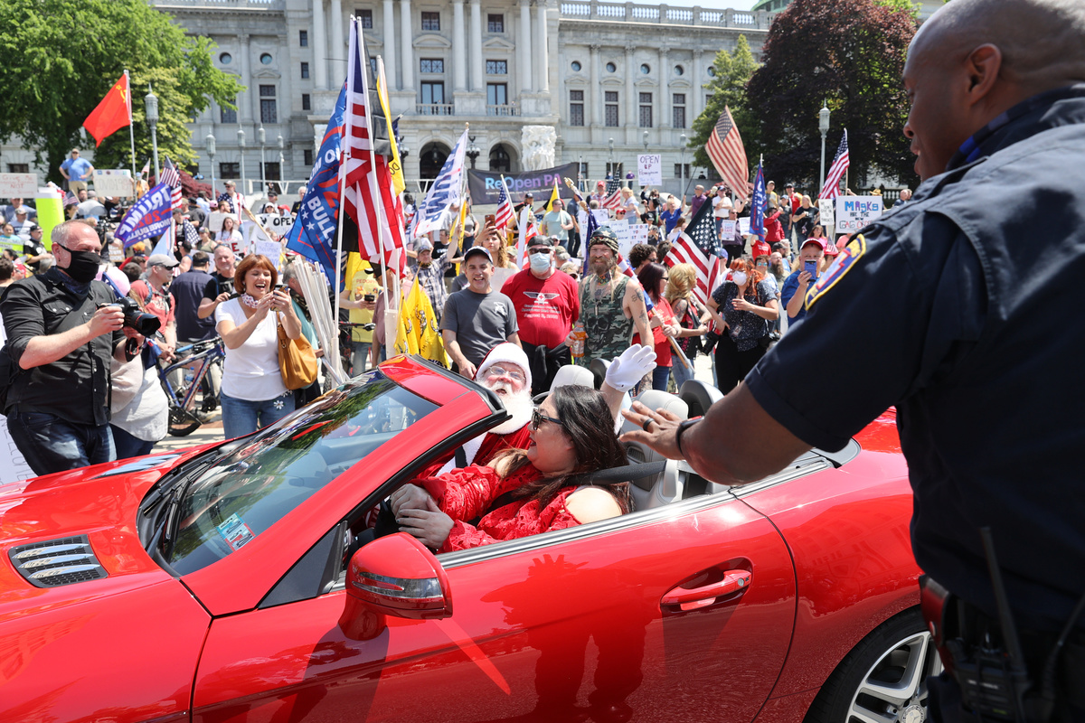 In Pennsylvania, hundreds of demonstrators gathered on the steps of the state capitol building in Harrisburg where they waved American and Trump 2020 flags and homemade signs, calling for the governor to fully reopen the state. Motorists including a man dressed as Santa Claus in a red convertible honked their horns in approval as they drove by.