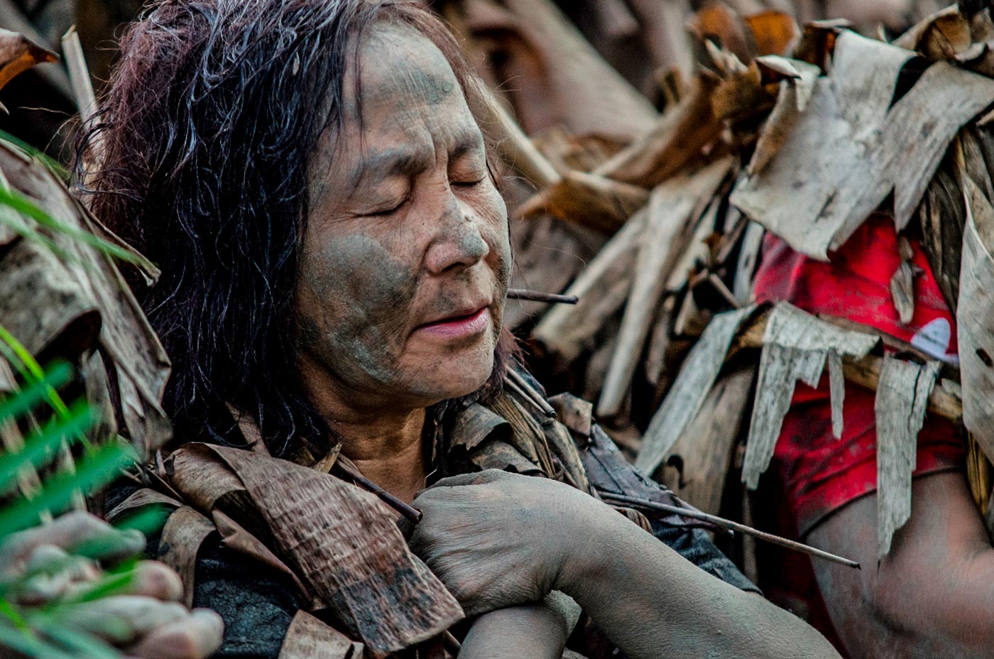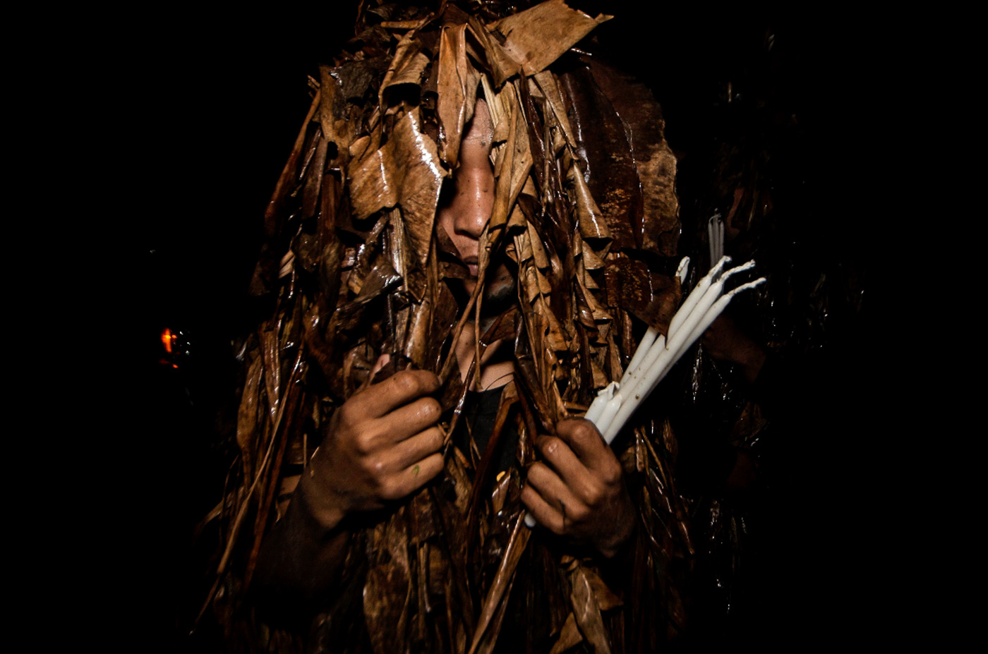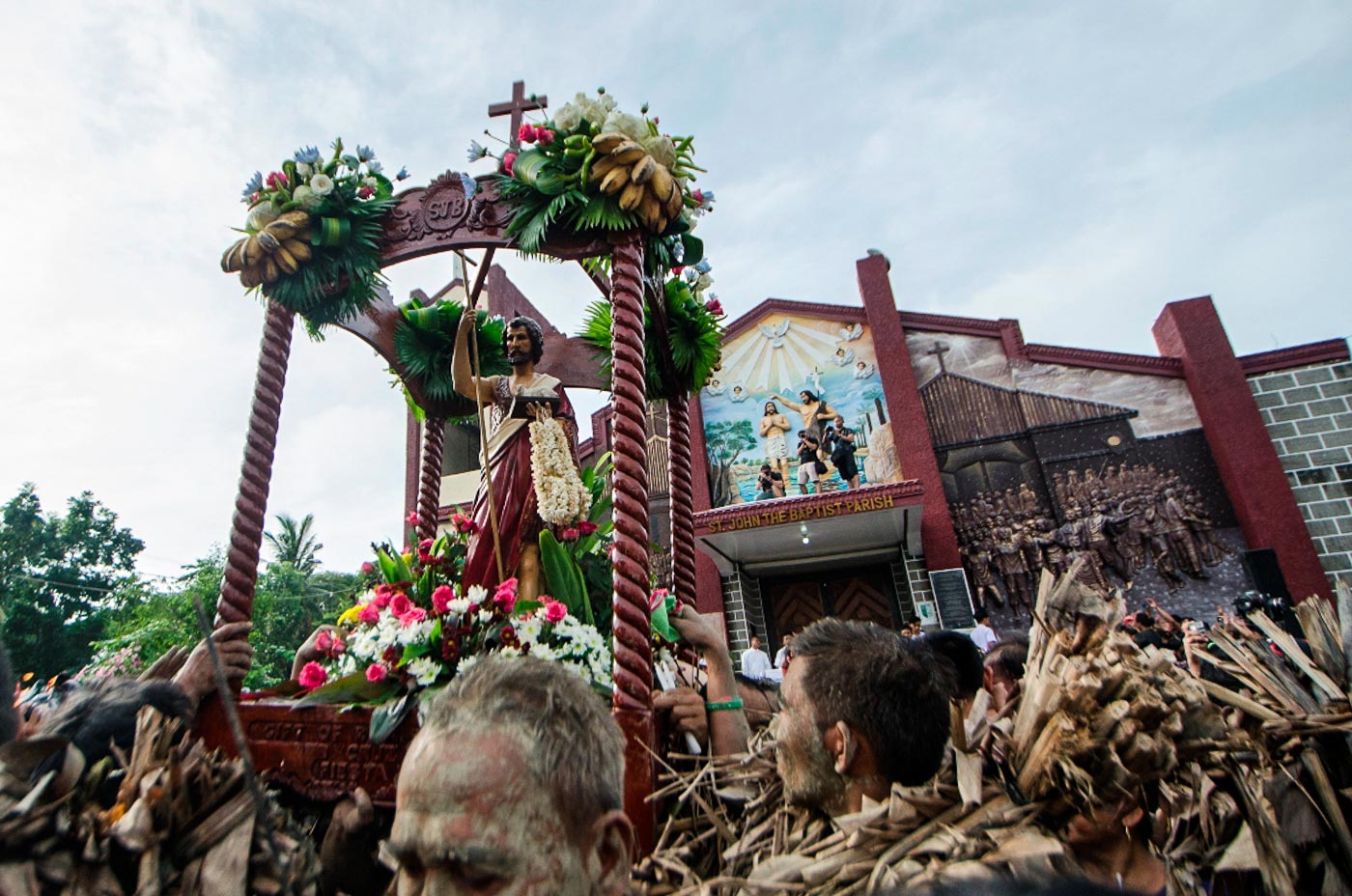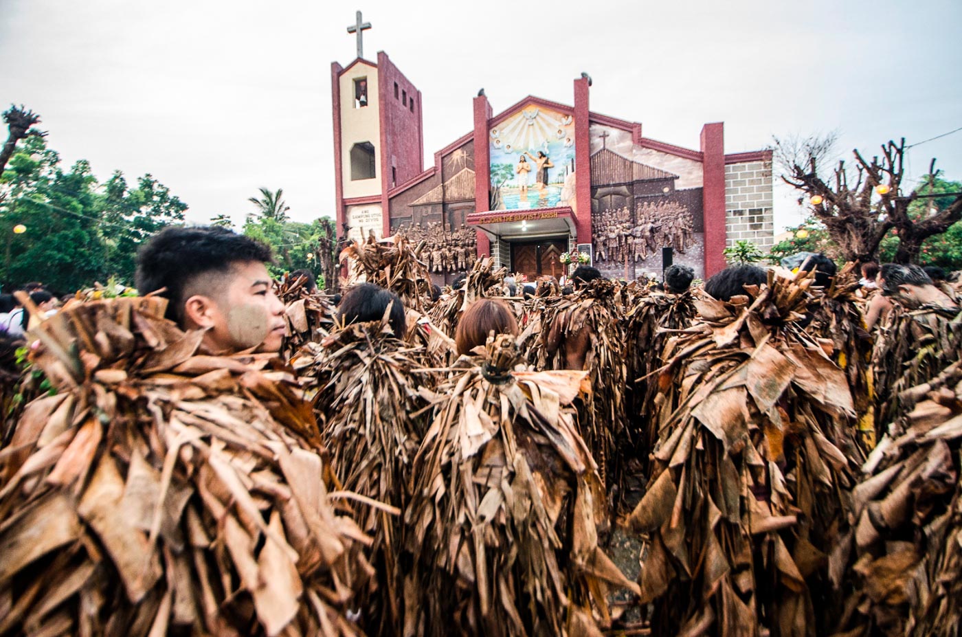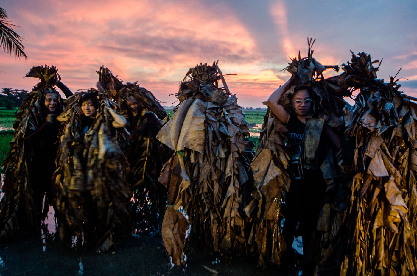 At dawn, men and women, young and old alike, gather at nearby rice fields. They spread mud all over their faces and bodies, and wear a cloak made from torn banana leaves, twigs, and vines to emulate John the Baptist's appearance when he baptized Christ. They transform themselves into "taong putik" (mud people).