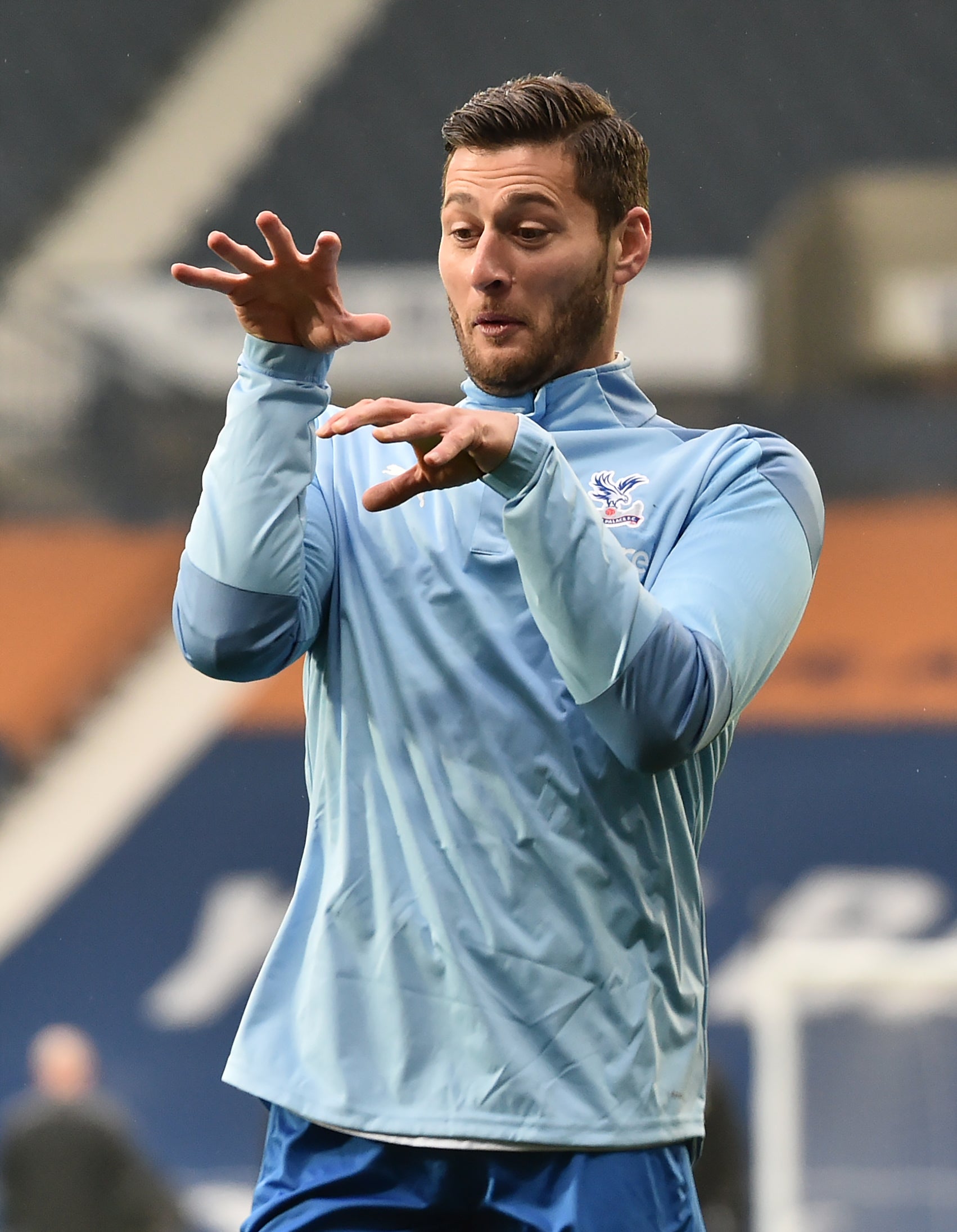 Crystal Palace defender Joel Ward goes through an unusual warm-up routine ahead of his side's 5-1 win at West Brom in December. Ward did not make it off the bench at The Hawthorns that day but went on to surpass 200 Premier League appearances during the season. Only Wilfried Zaha has made more outings in the competition for the Eagles (PA Wire)