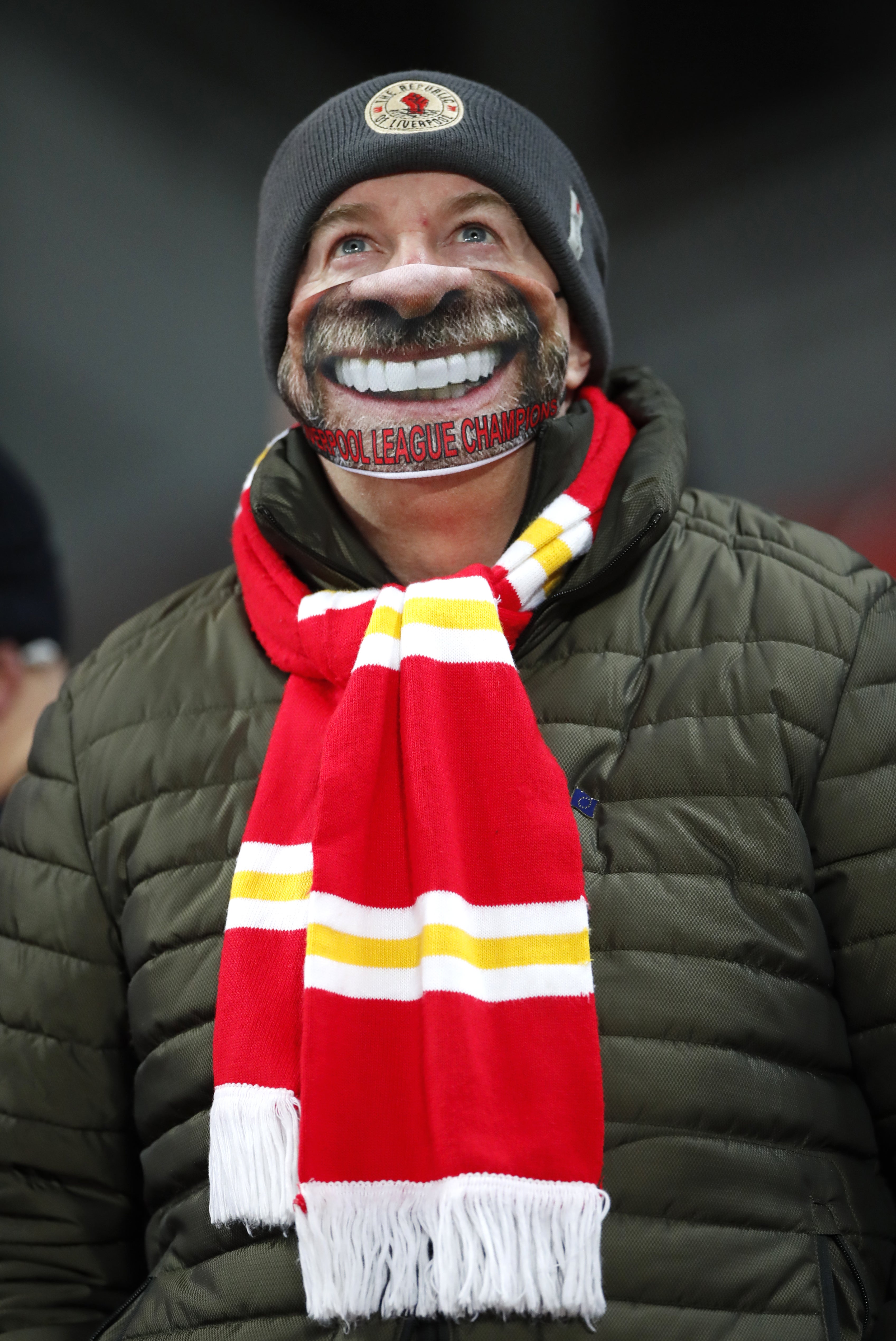 A lucky Liverpool fan sports a novelty face mask after being among the select few to acquire a ticket to attend the fixture against Wolves in early December. Almost nine months after the last Premier League game was played in front of spectators, the Reds gave their 2,000 followers in attendance plenty to smile about by running out resounding 4-0 winners over Wolves (PA Wire)