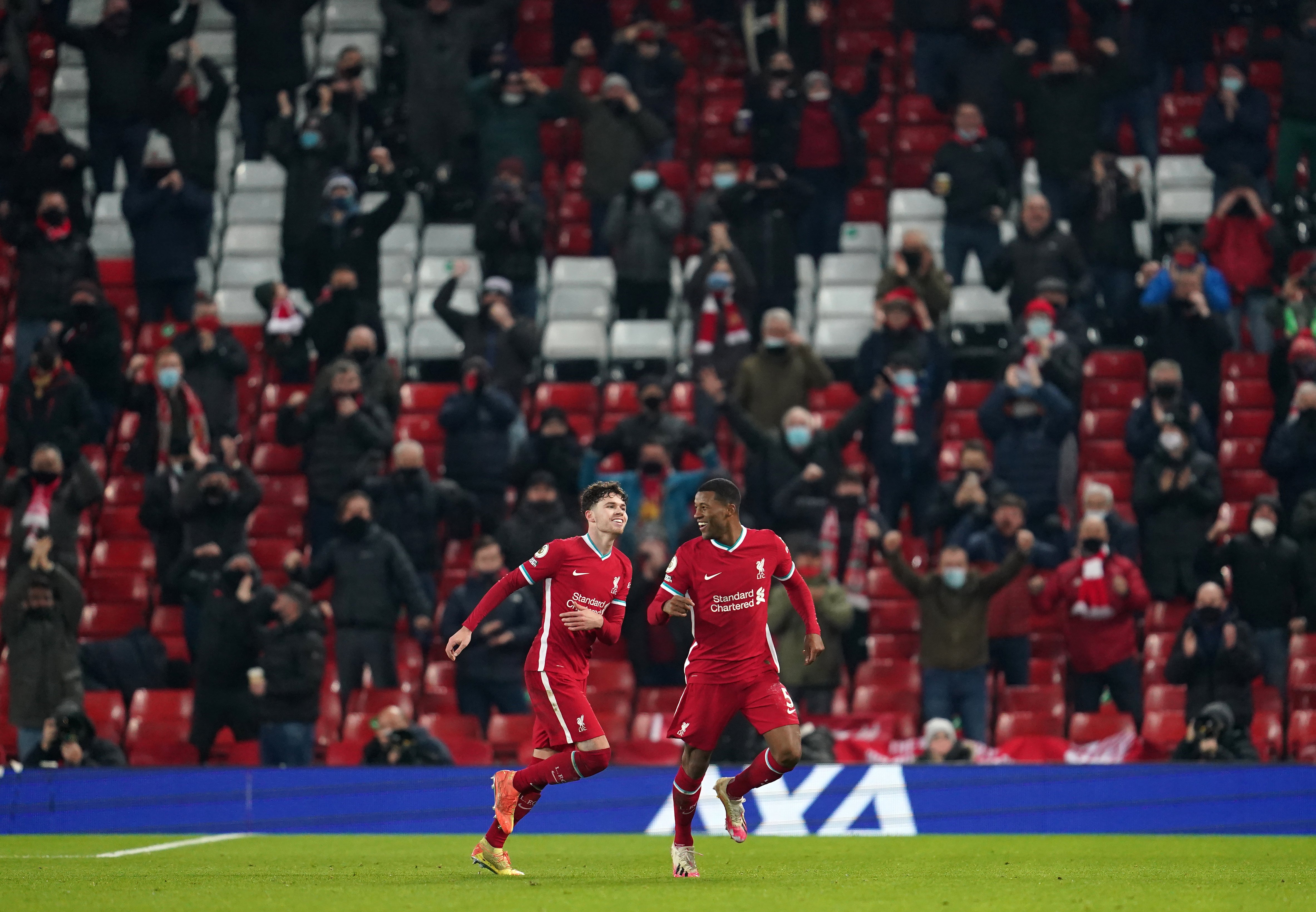 Georginio Wijnaldum, right, celebrates scoring Liverpool's second goal in a 4-0 win over Wolves on December 6. The game was notable for the return of fans, with 2,000 Reds supporters at Anfield to watch their club for the first time as Premier League champions. Games soon returned to being played behind closed doors after England entered another lockdown following Christmas (PA Wire)