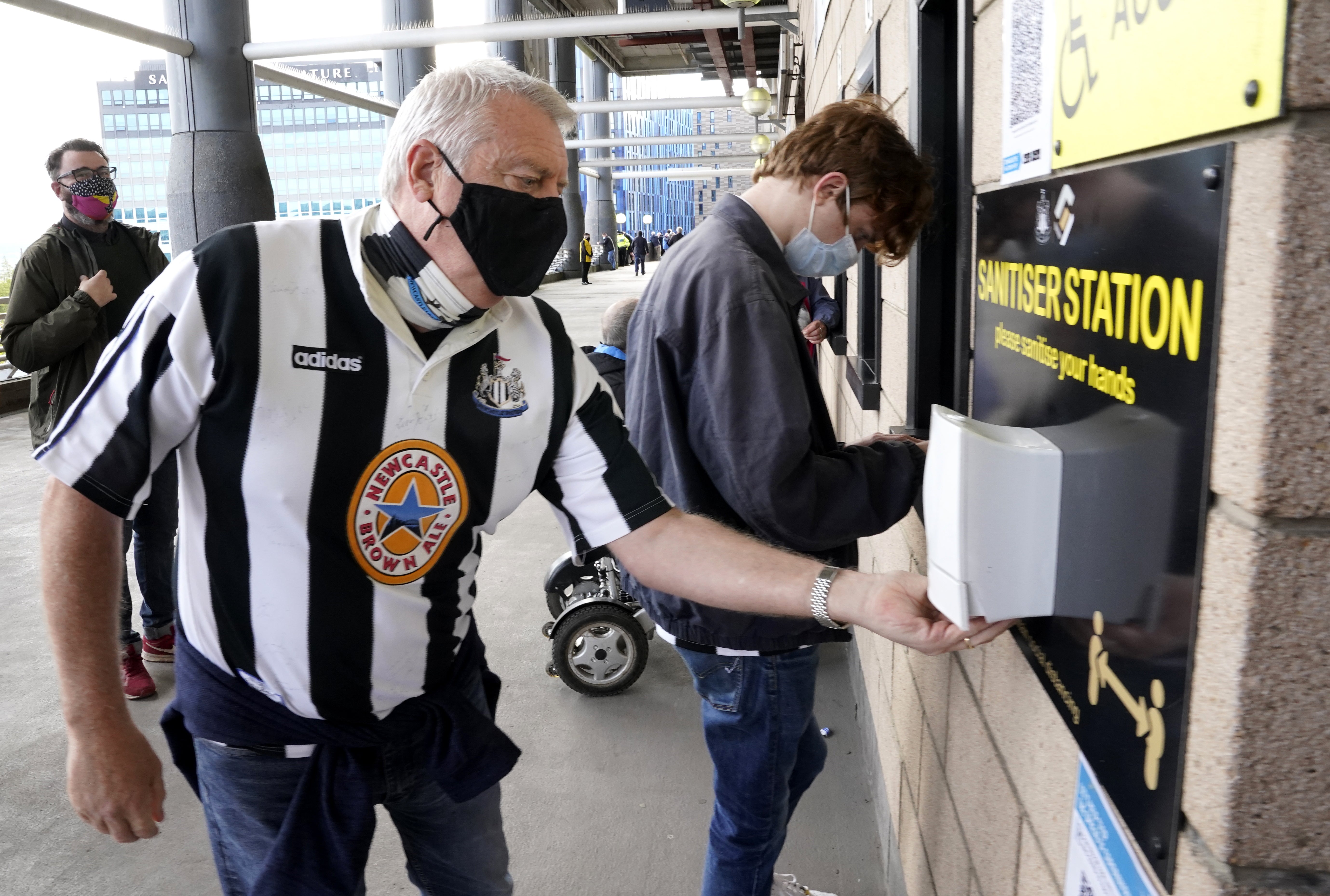 Face mask-wearing Newcastle fans use a hand sanitising station ahead of the Premier League match against Sheffield United at St James’ Park. Despite the season ending on the high of having supporters back in stadia, the experience of attending matches is noticeably different to pre-pandemic conditions. Football fans will have to adapt to a 'new normal' at grounds, with the wait for the return of capacity crowds set to continue for the foreseeable future (Owen Humphreys/PA) (PA Wire)