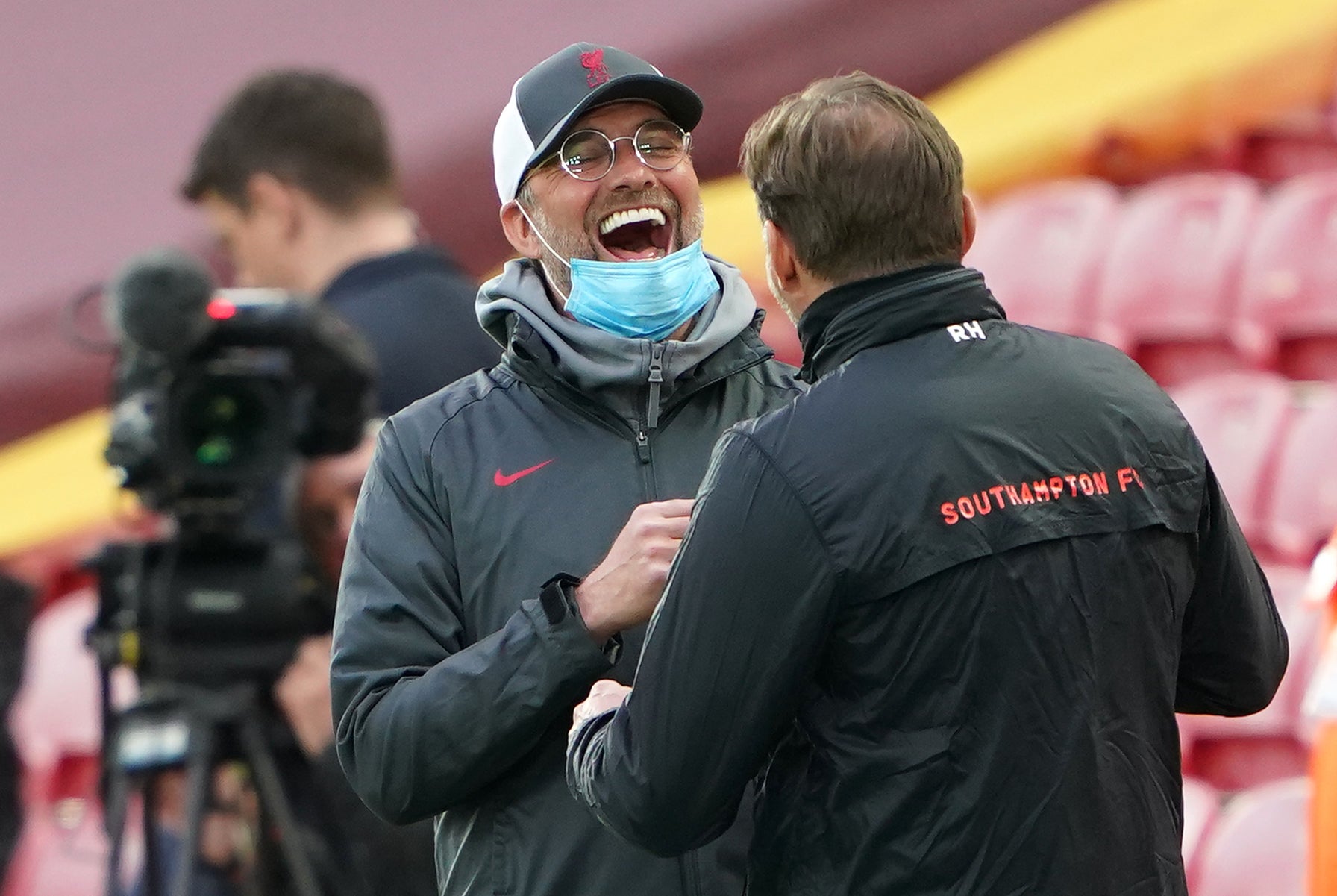 Liverpool manager Jurgen Klopp shares a joke with Southampton boss Ralph Hasenhuttl ahead of their sides' meeting at Anfield in May. Klopp had little to laugh about for large parts of a difficult season. The Reds produced a limp title defence, including suffering a 7-2 thrashing at Aston Villa in October and six successive home losses between January and March (PA Wire)
