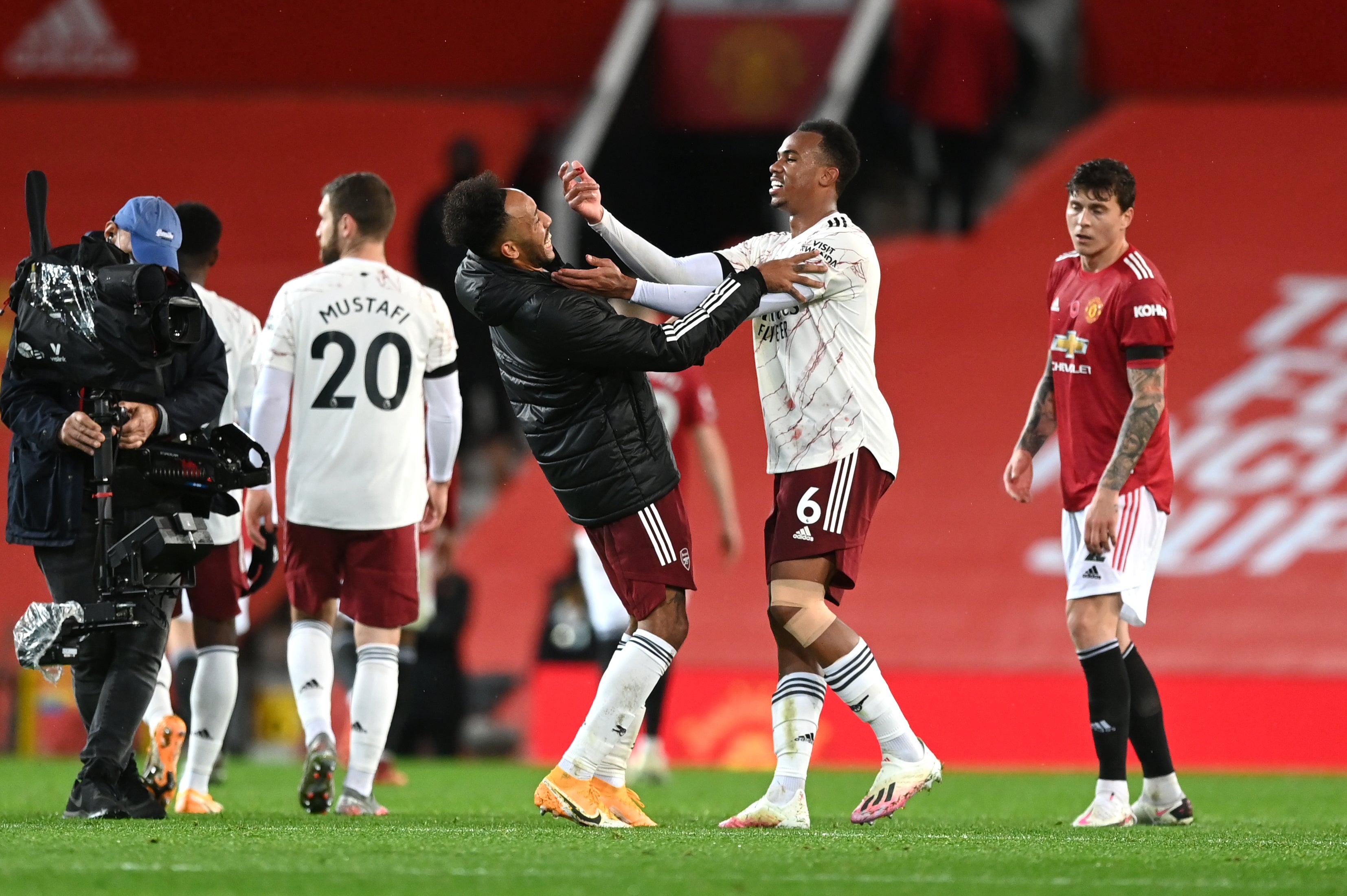Arsenal captain Pierre-Emerick Aubameyang, left, shares a joke with team-mate Gabriel Magalhaes following a 1-0 victory over Manchester United. Despite winning at Old Trafford at the start of November, the Gunners had a season to forget. Having signed a new contract last summer, Aubameyang was unable to consistently replicate the red-hot form shown in 2019-20, with his struggles epitomising the club's (PA Archive)