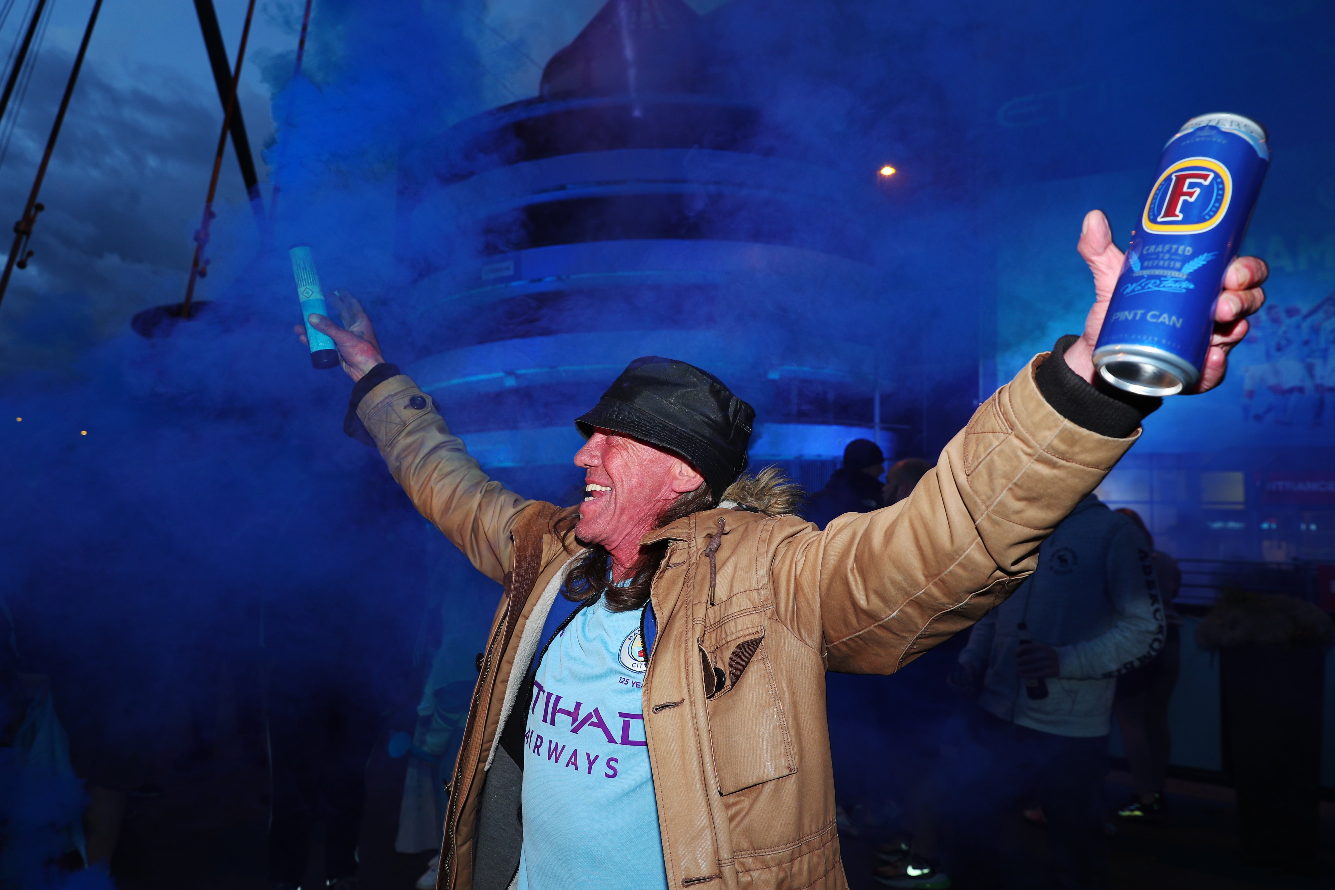 A jubilant Manchester City fan celebrates his club regaining the Premier League title by lighting a flare outside the Etihad Stadium. City were confirmed champions on May 11 after second-placed Manchester United were beaten 2-1 at home by Leicester. Glory for Pep Guardiola's side, who are set to lift the trophy in front of 10,000 supporters after hosting Everton on Sunday, was their third title success in four seasons (PA Wire)