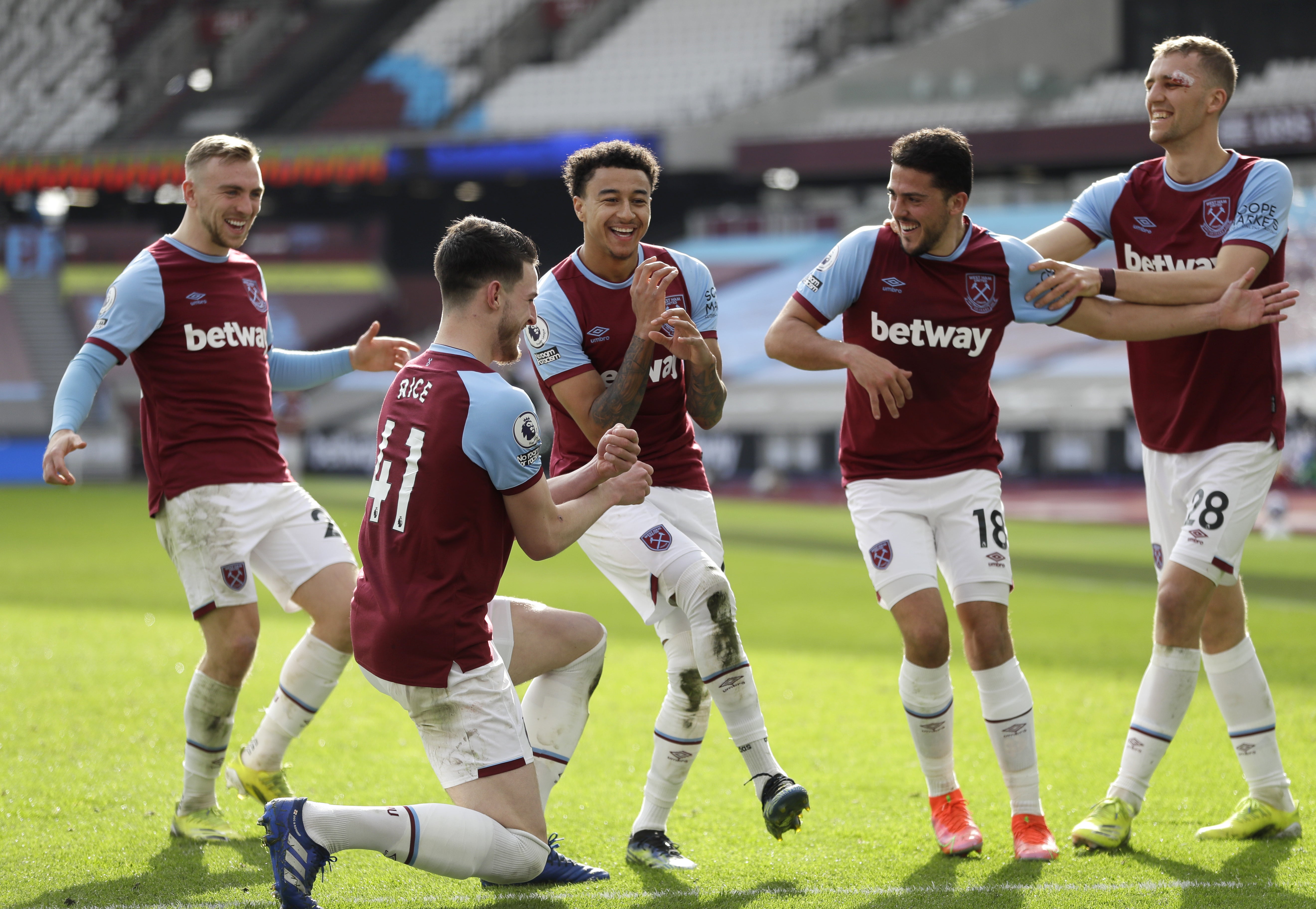 Jesse Lingard, middle, celebrates after scoring for West Ham against Tottenham in February. On-loan Manchester United man Lingard proved to be an inspired signing for David Moyes' men following his arrival in January. His fine goal-scoring form significantly helped the Hammers' push for European qualification, with this musical celebration prompting the quintet involved to be dubbed the 'Backstreet Moyes' by team-mate Michail Antonio (PA Wire)