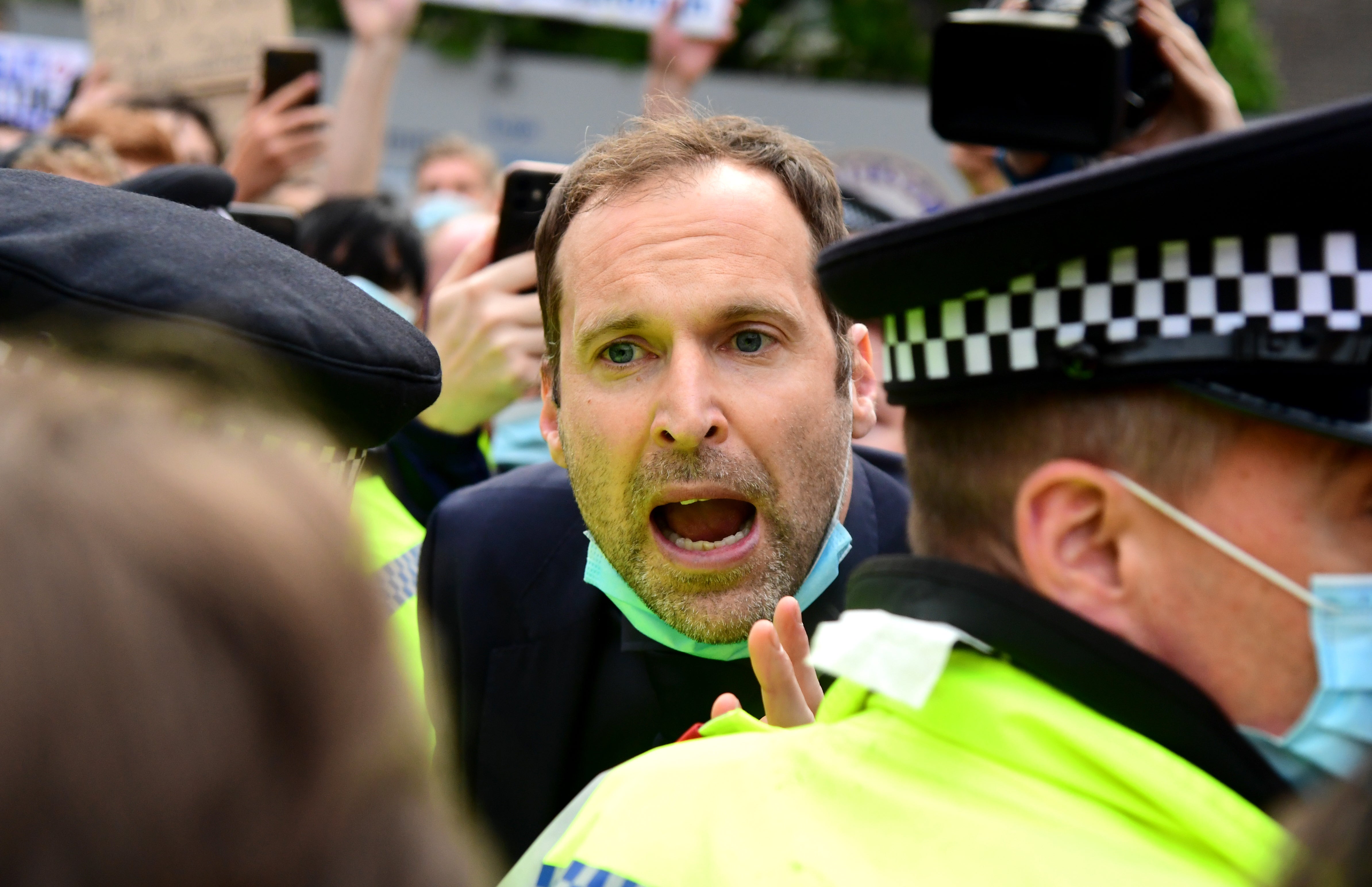 Petr Cech, Chelsea's technical and performance advisor, attempts to defuse protests ahead of the Premier League game with Brighton on April 20. Furious Blues fans stormed Fulham Road at tea time, unfurling expletive-laden banners criticising the club's decision to join the doomed European Super League. Police riot vans raced around west London and helicopters circled overhead, while the evening kick-off was delayed by 15 minutes (PA Wire)