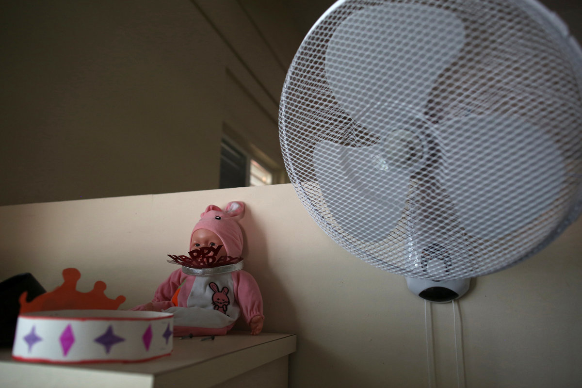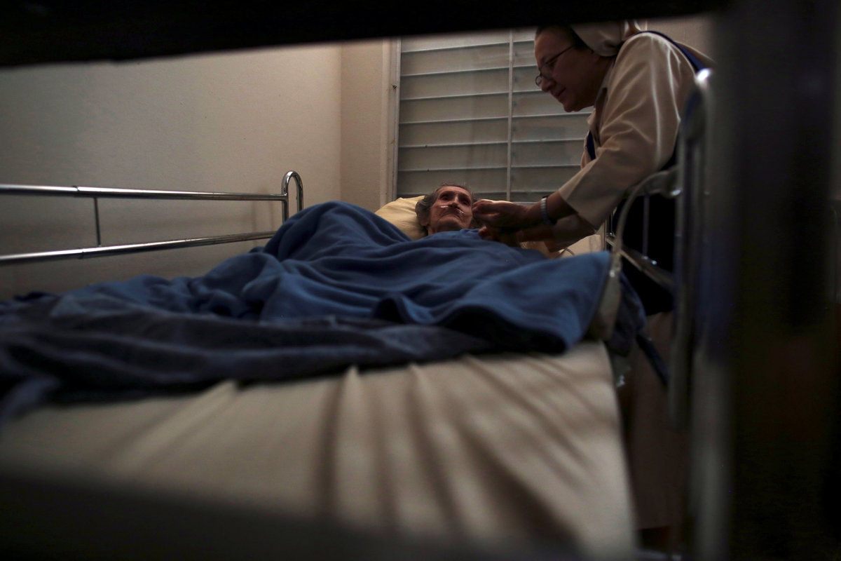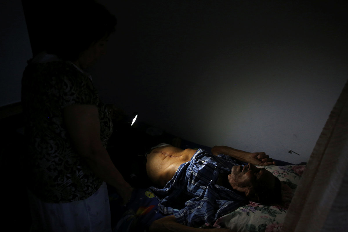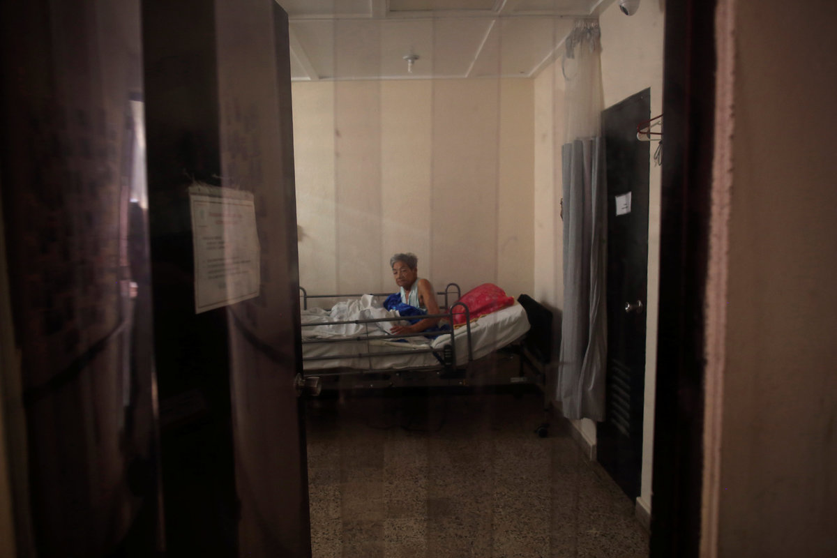 His wife, Zoraida Reyes, 77, struggles to keep the house stocked with fresh food without a refrigerator. At night, she fans her husband so he can sleep.