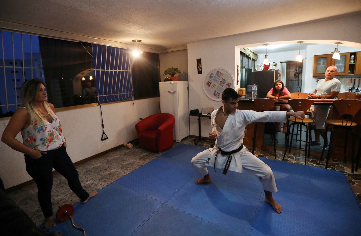 Venezuela team karateka Ricardo Perez during a training session at home with his family, following the outbreak of the coronavirus disease (COVID-19), Caracas, Venezuela, May 8, 2020. REUTERS/Manaure Quintero