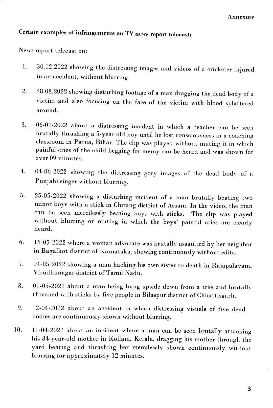 Examples included a telecast on December 30 of “distressing images and videos” of a cricketer following an accident, referring to Rishabh Pant’s road accident on the Delhi-Dehradun highway. Another on July 6 showed a teacher “brutally thrashing” a child (video footage of this incident). The list included “distressing gory images” of singer Sidhu Moose Wala, who was killed last May.