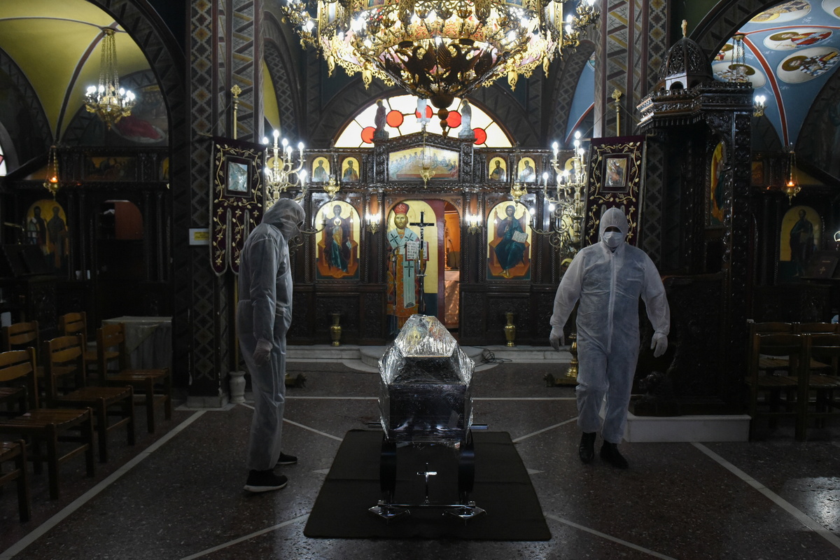 At the Resurrection of the Lord Cemetery in Thessaloniki, on the eastern side of Greece's second largest city, many new graves have been opened. The Greek Orthodox chapel in the compound conducts funeral services, with pallbearers in full protective clothing.